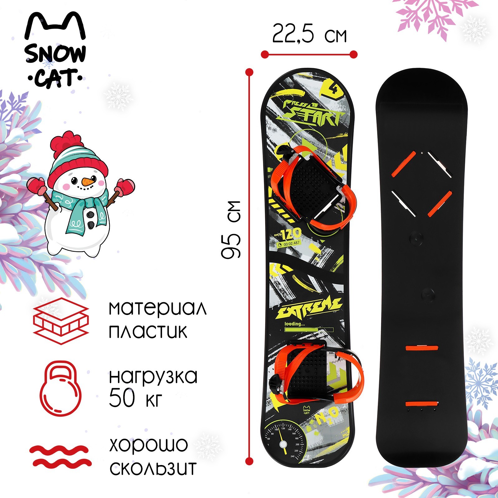 Сноуборд детский. Сноуборд изготовлен из морозостойкого композиционного материала, выдерживает динамические нагрузки и отлично набирает скорость. Нога крепится с помощью ремней, которые регулируются по длине пряжкой и закрепляются защёлкой. Для надёжной фиксации пятки есть дополнительная накладка на задний ремень. На доске под креплением имеются площадки с противоскользящими шипами, это делает катание более комфортным и безопасным. Крепления для ног регулируются, их можно настроить под правую и левую ногу. Благодаря небольшому весу ребёнок сможет носить сноуборд. Подойдёт для катания с горки по прямой, а также для управления доской и выполнения простых элементов сноубординга. Особенности Материал: пластик.Комплектация: сноуборд с двумя креплениями.Размер доски: 95 22,5 см.Возраст: 5+.Максимальная нагрузка: 50 кг.Цвет:Разноцветный|Для кого:Унисекс|Размер, см:22.5|Размер, см:95|Уровень:Новичок|Стиль катания:Классический|Страна:Россия  развернуть описание ▼