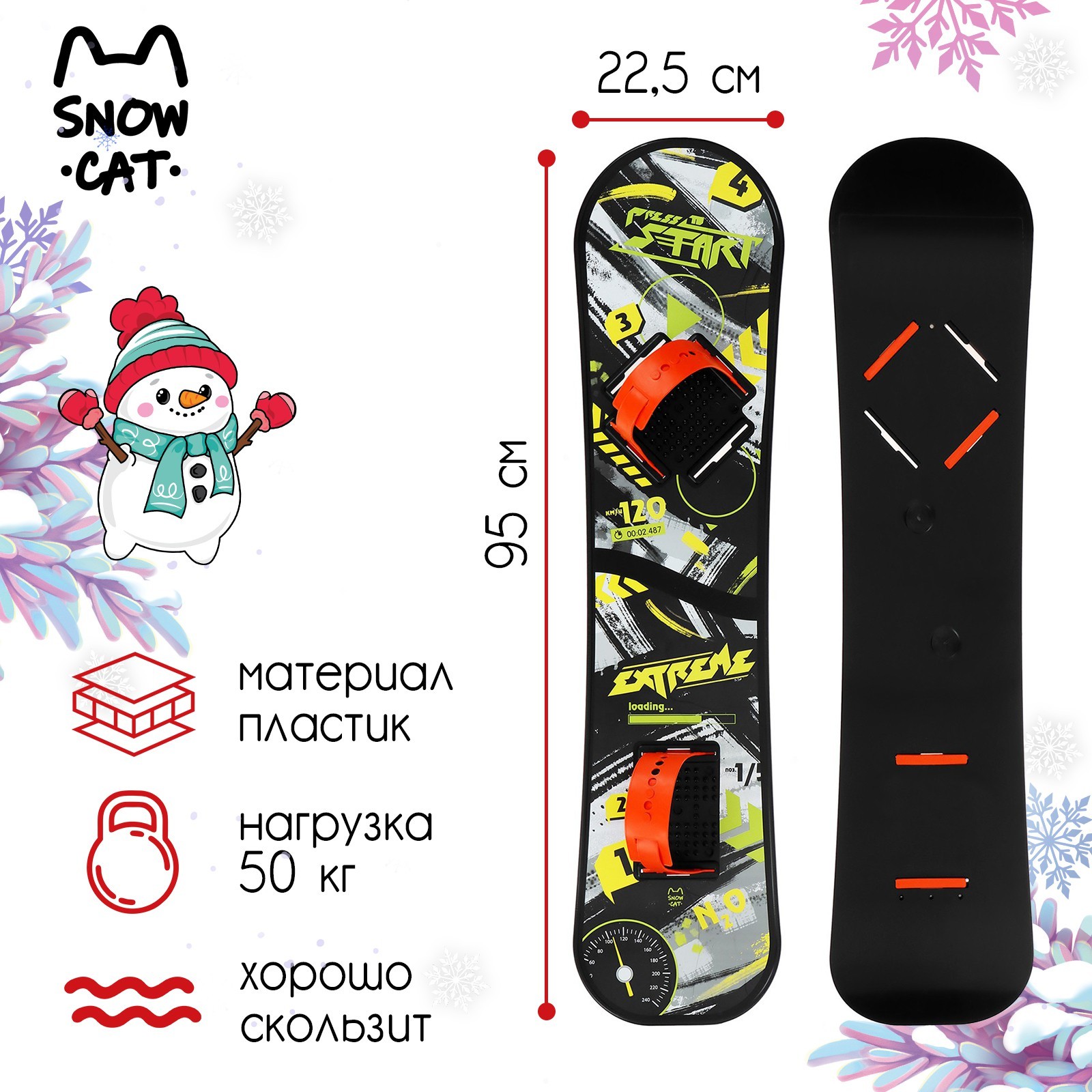 Сноуборд детский snow cat с облегчёнными креплениями, 95 см, цвет разноцветный. Сноуборд изготовлен из морозостойкого композиционного материала, выдерживает динамические нагрузки и отлично набирает скорость. Нога крепится с помощью одного переднего ремня, регулируемого по длине. За счёт этого можно быстро вставить ногу в крепление и также легко освободиться. На доске под креплением имеются площадки с противоскользящими шипами, это делает катание более комфортным и безопасным. Крепления для ног регулируются, их можно настроить под правую и левую ногу. Благодаря небольшому весу ребёнок сможет носить сноуборд. Подойдёт для катания с горки по прямой. Особенности Материал: пластик.Комплектация: сноуборд с двумя облегчёнными креплениями.Размер ледянки: 95 22,5 см.Возраст: 5+.Максимальная нагрузка: 50 кг.Цвет:Разноцветный|Для кого:Унисекс|Размер, см:22.5|Размер, см:95|Уровень:Новичок|Стиль катания:Классический|Страна:Россия  развернуть описание ▼