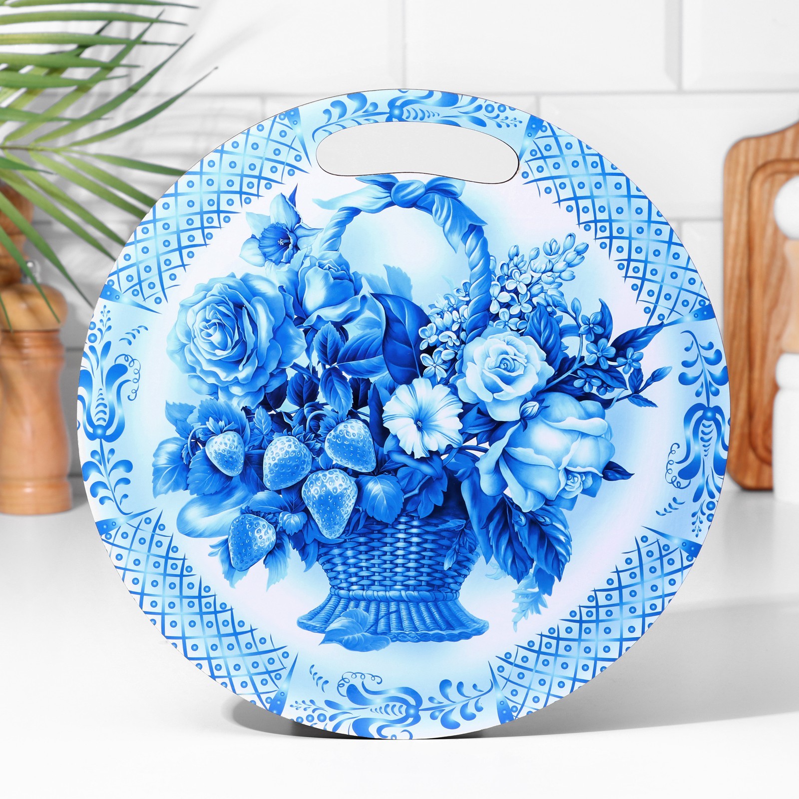 Доска разделочная и сервировочная круглая кухонная "гжельская роспись", 25,5 см