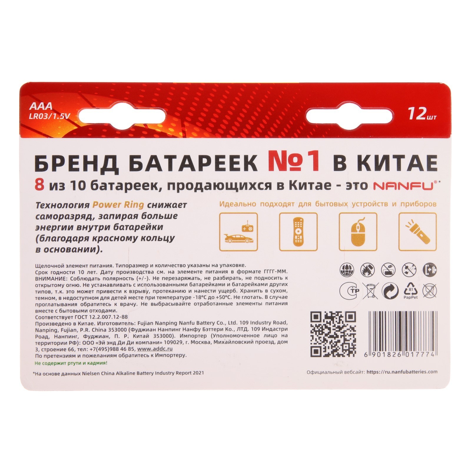 Батарейка алкалиновая nanfu, aaa, lr03-12bl, 1.5в, блистер, 12 шт.. parts count: 0 Гарантийный срок, мес.: 12 В упаковке, шт.: 12 Вид упаковки: Блистер Типоразмер батареек: AAA (LR03) Тип батарейки: Алкалиновая Температурное ограничение: Нет  развернуть описание ▼