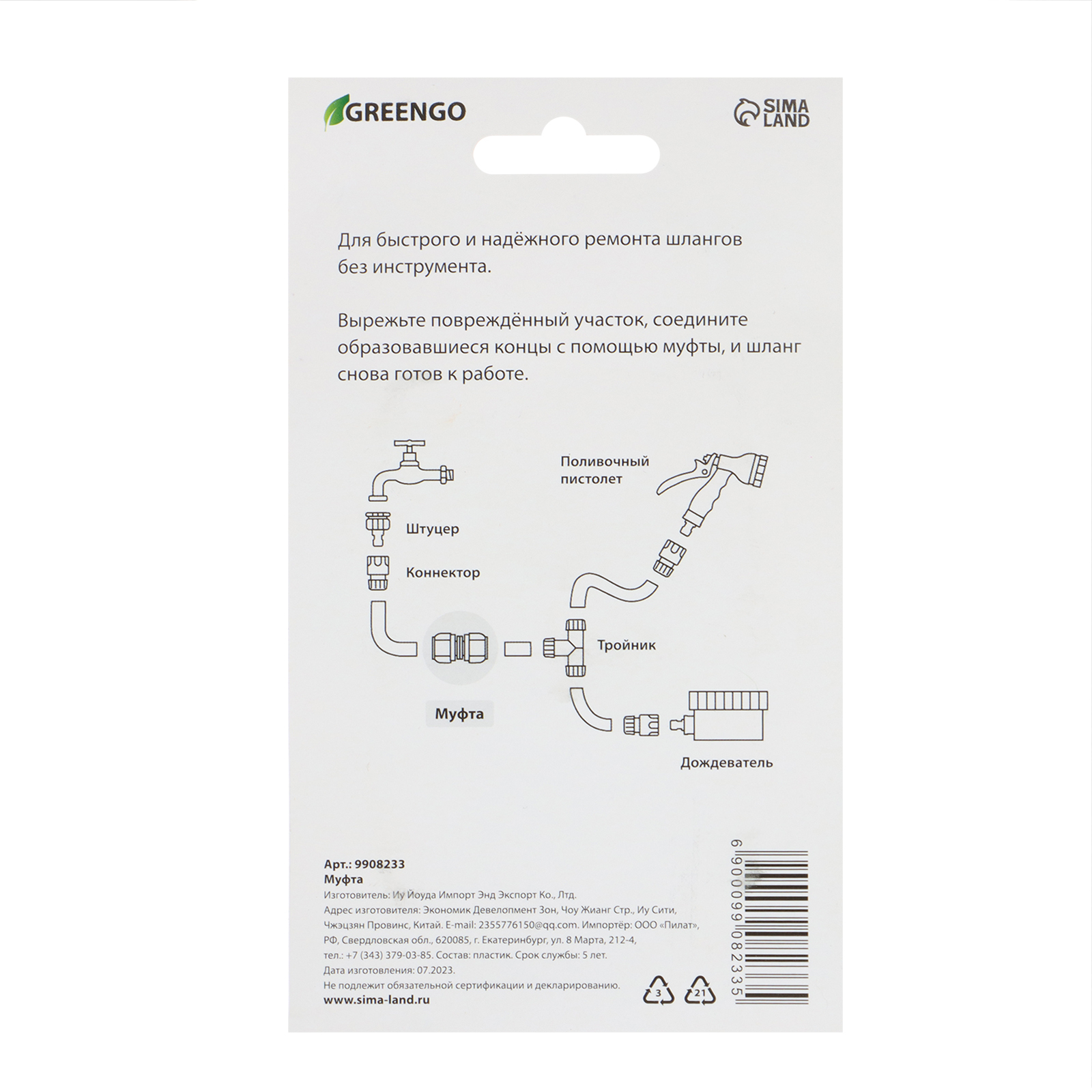 Муфта соединительная, для шлангов 3/4 (19 мм), цанговое соединение, прорезиненный пластик, Greengo