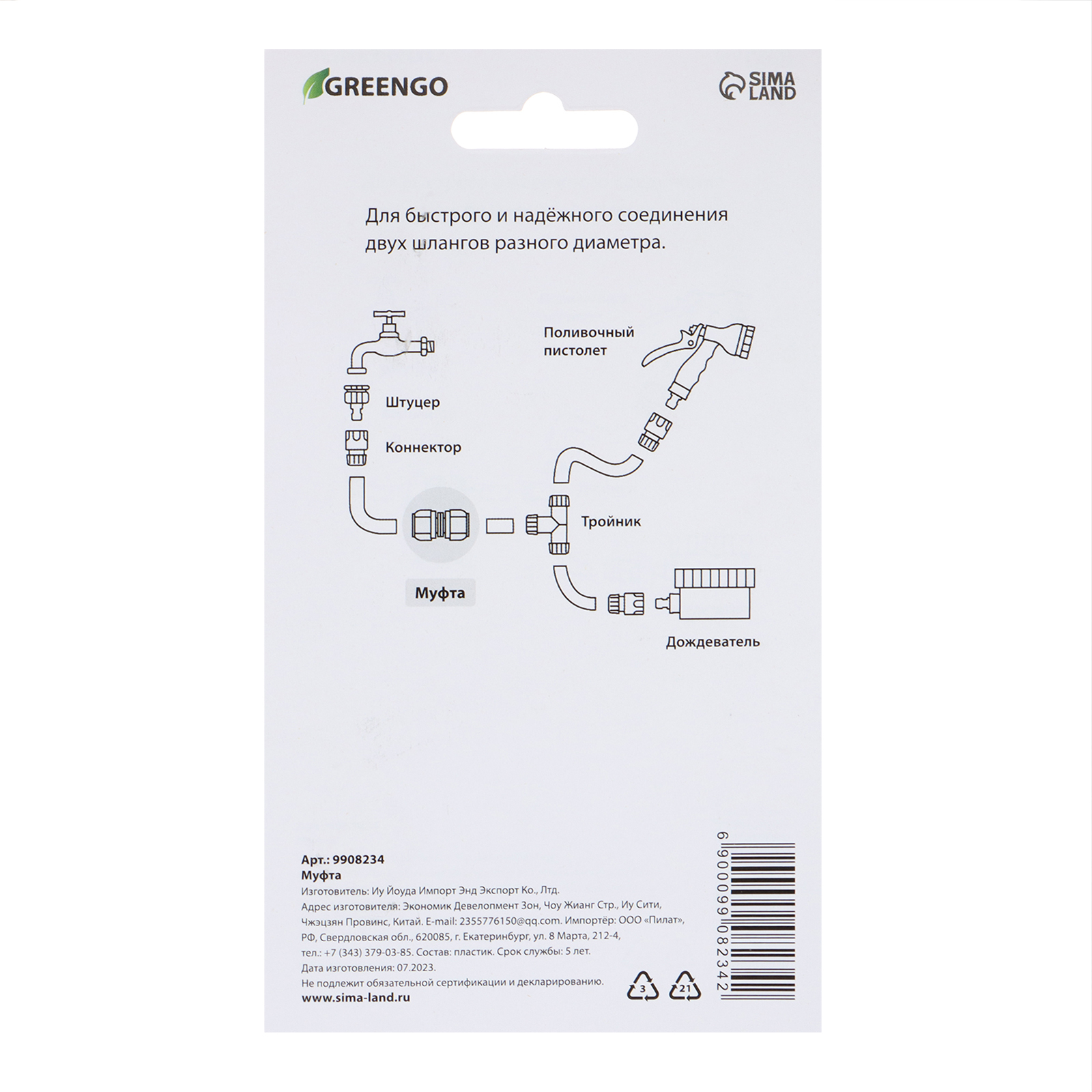 Муфта переходная, для шлангов 1/2 (12 мм) и 3/4 (19 мм), цанговое соединение, прорезиненный пластик, Greengo