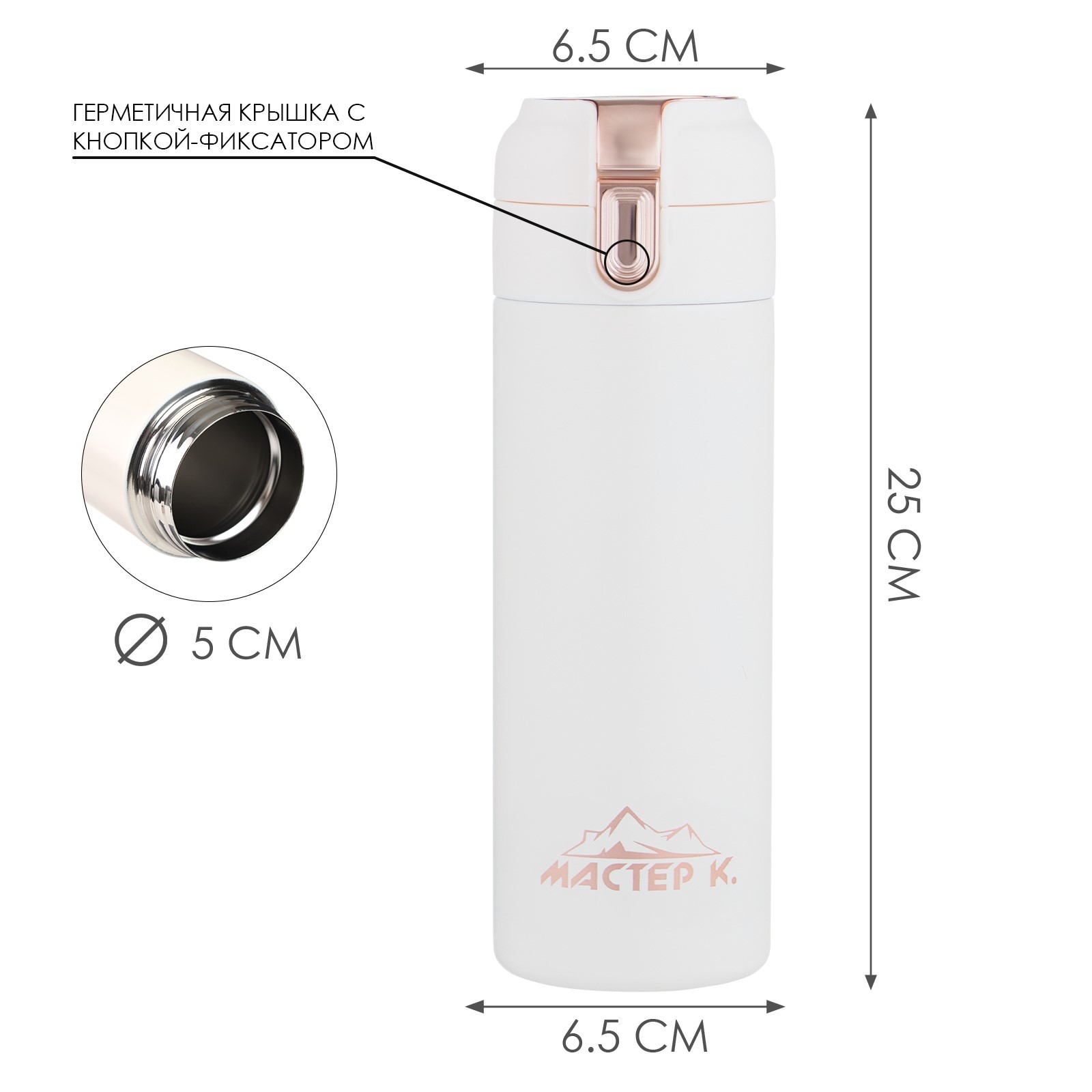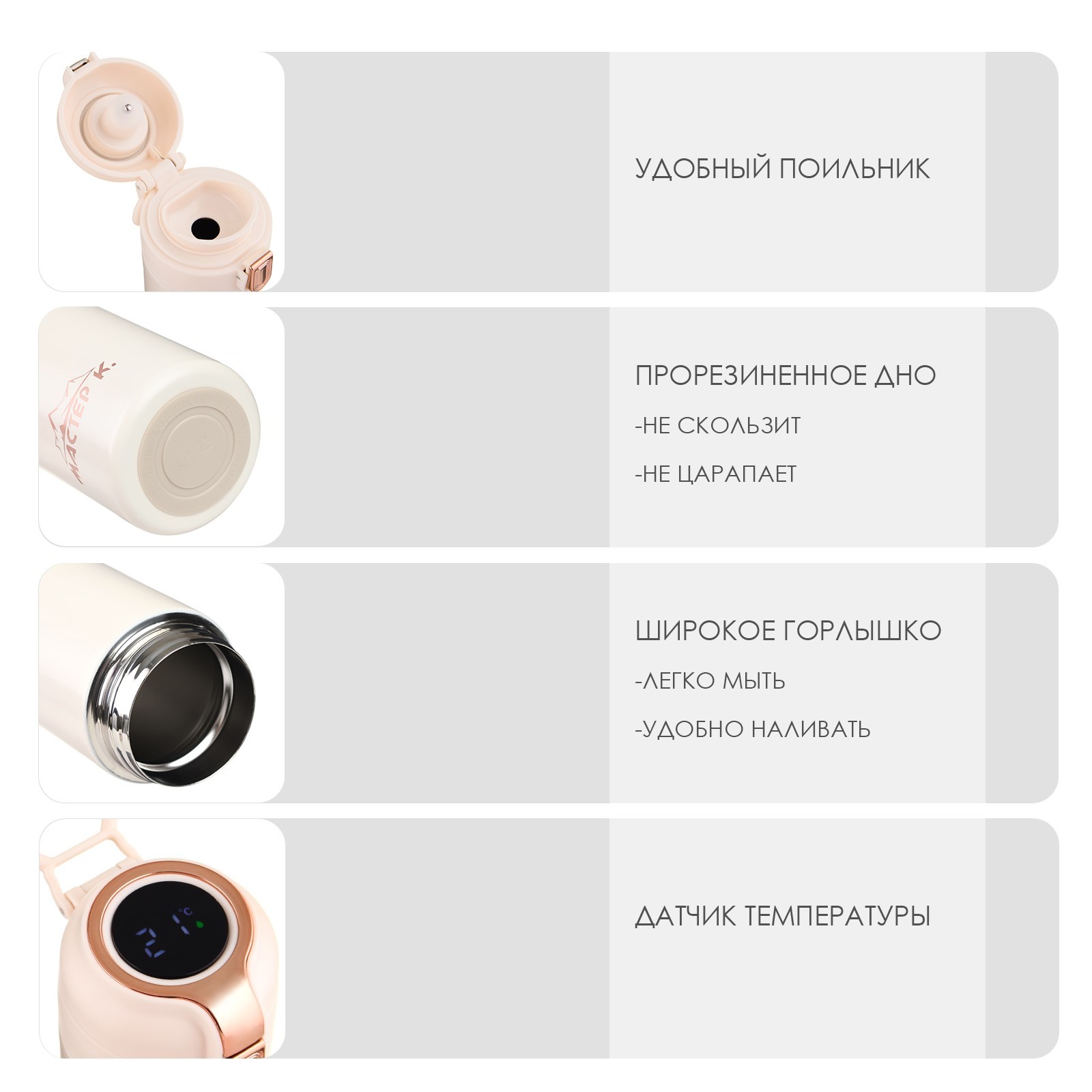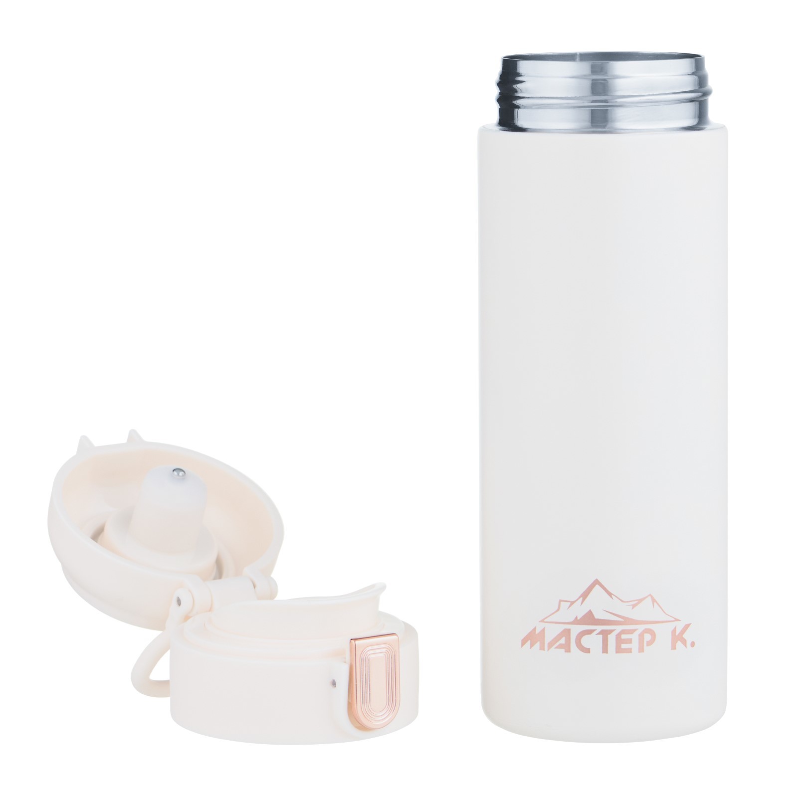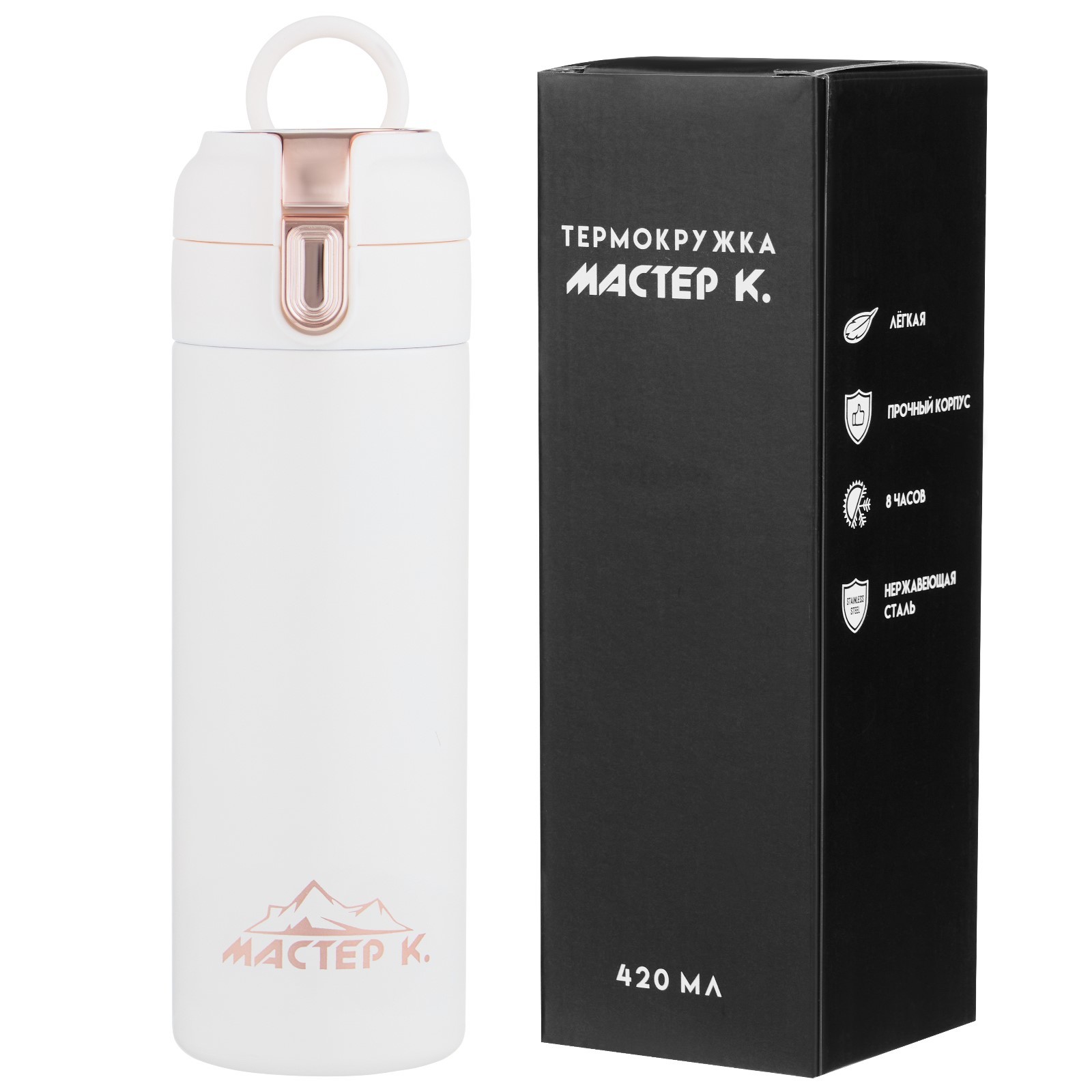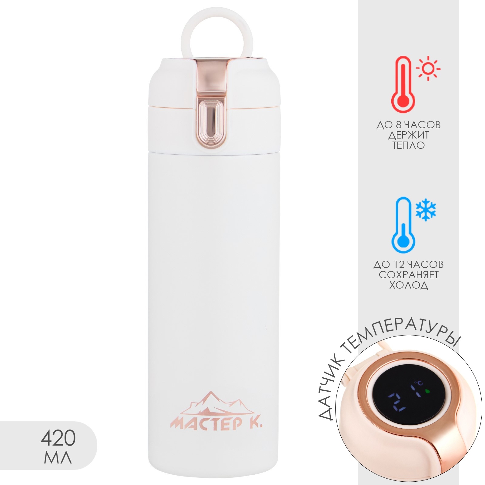 Термокружка, 420 мл, simple "мастер к", с термометром, сохраняет тепло до 8 ч, белая. Термокружка для кофе и чая "Мастер К" с термометром идеальна для офиса, автомобиля, длительных прогулок и детям в школу. Благодаря специальному покрытию надежно лежит в руке. Термокружка - это стильный аксессуар и отличный подарок на новый год, другу, подруге, брату, сестре, девушке, папе, маме, мужу, жене, бабушке и дедушке на день рождения, 23 февраля, 8 марта, 14 февраля. Термокружка сделана из нержавеющей стали марки 304, сконструирована по вакуумной технологии, с двойной стенкой, следовательно, долго держит тепло и не проливается. Оснащена откидывающейся крышкой, изготовленной из экологичного пищевого пластика. На дне термокружка имеет специальную прорезиненную основу, предотвращающую царапины на поверхностях. Особенности: оснащена термометром и дисплеем, на котором отображается текущая температура напиткаМожно открывать и закрывать одной рукойУдобное горлышко (поильник)Нескользящее дноСтавится в автомобильный подстаканникОткрывается с помощью нажатия100% защита от протеканияСтильный дизайн, приятна на ощупьСохраняет тепло или холод до 8 часовДвойные стенки из нержавеющей сталиПеред первым применением обдайте внутреннюю колбу кипятком. После того, как нальёте горячий напиток, через несколько секунд откройте кружку, выпустите пар и снова закройте. Так напиток дольше сохранит температуру. Нельзя мыть в посудомоечной машине и нагревать в микроволновой печи. Цвет: Белый Объём, л: 0.42 Время сохранения тепла/холода, ч: 8 Объём, мл: 420 tnved: 7323930000 Крышка: Нет Материал: Пластик Особенности: С датчиком  развернуть описание ▼