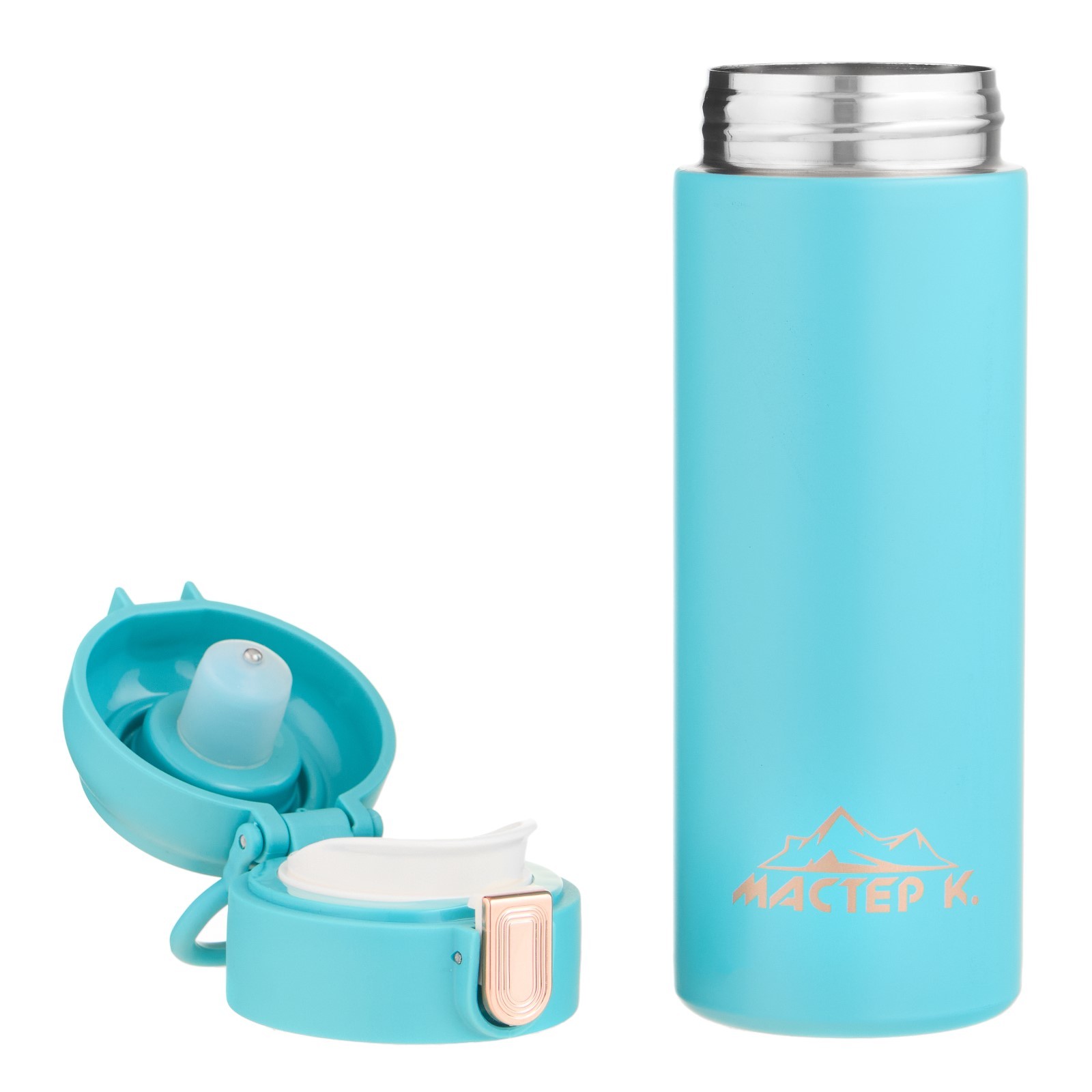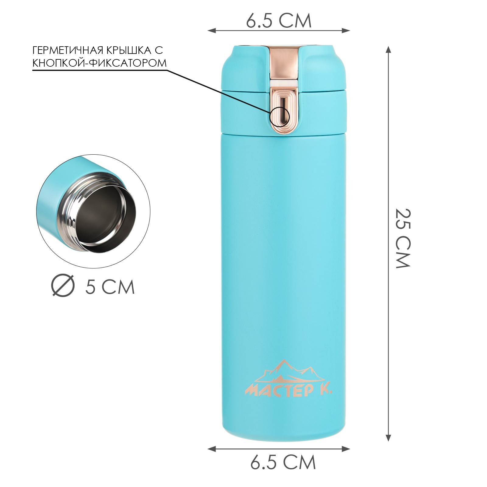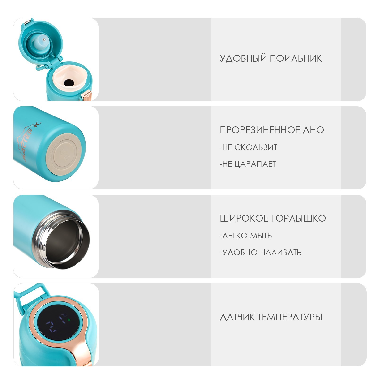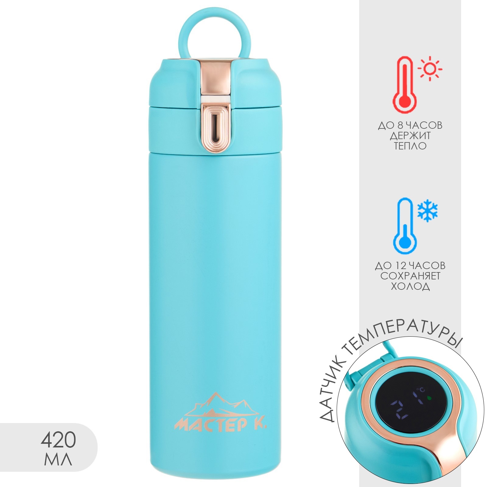 Термокружка, 420 мл, simple "мастер к", с термометром, сохраняет тепло до 8 ч, голубая. Термокружка для кофе и чая "Мастер К" с термометром идеальна для офиса, автомобиля, длительных прогулок и детям в школу. Благодаря специальному покрытию надежно лежит в руке. Термокружка - это стильный аксессуар и отличный подарок на новый год, другу, подруге, брату, сестре, девушке, папе, маме, мужу, жене, бабушке и дедушке на день рождения, 23 февраля, 8 марта, 14 февраля. Термокружка сделана из нержавеющей стали марки 304, сконструирована по вакуумной технологии, с двойной стенкой, следовательно, долго держит тепло и не проливается. Оснащена откидывающейся крышкой, изготовленной из экологичного пищевого пластика. На дне термокружка имеет специальную прорезиненную основу, предотвращающую царапины на поверхностях. Особенности: оснащена термометром и дисплеем, на котором отображается текущая температура напиткаМожно открывать и закрывать одной рукойУдобное горлышко (поильник)Нескользящее дноСтавится в автомобильный подстаканникОткрывается с помощью нажатия100% защита от протеканияСтильный дизайн, приятна на ощупьСохраняет тепло или холод до 8 часовДвойные стенки из нержавеющей сталиПеред первым применением обдайте внутреннюю колбу кипятком. После того, как нальёте горячий напиток, через несколько секунд откройте кружку, выпустите пар и снова закройте. Так напиток дольше сохранит температуру. Нельзя мыть в посудомоечной машине и нагревать в микроволновой печи. Цвет: Бирюзовый Объём, л: 0.42 Время сохранения тепла/холода, ч: 8 Объём, мл: 420 tnved: 7323930000 Крышка: Нет Материал: Пластик Особенности: С датчиком  развернуть описание ▼