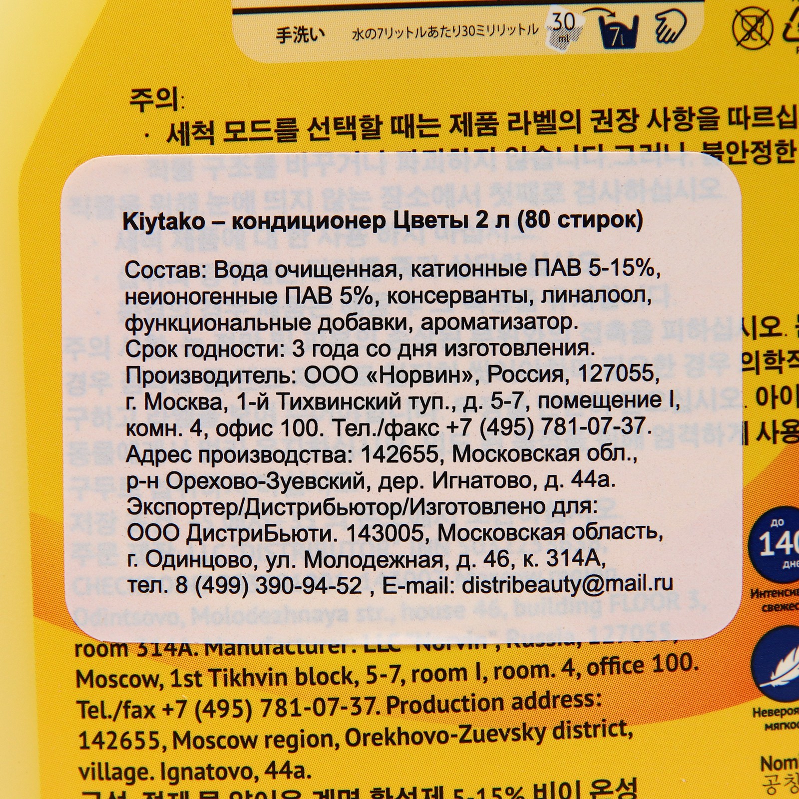Кондиционер для белья kiytako flowers, 2 л. Кондиционер для белья KIYTAKO Flowers - это идеальное решение для тех, кто ищет эффективное и безопасное средство для стирки. Объем флакона составляет 2 литра, что делает его экономичным и удобным в использовании. Кондиционер KIYTAKO Flowers обладает приятным цветочным ароматом, который остается на вещах после стирки. Он подходит для всех типов тканей, включая деликатные, и не повреждает их структуру и цвет. Кондиционер KIYTAKO Flowers обеспечивает бережный уход за тканью, сохраняя ее первоначальную структуру и цвет. Он эффективно удаляет пятна и загрязнения, смягчает ткани и придает им свежесть. Кроме того, кондиционер KIYTAKO Flowers обладает антибактериальным эффектом, что позволяет уничтожить бактерии и микробы, которые могут вызывать неприятный запах и повреждать ткани. В целом, кондиционер для белья KIYTAKO Flowers - это отличный выбор для тех, кто хочет сохранить свои вещи в идеальном состоянии на долгое время. Объём, л: 2 Аромат: Цветы Назначение: Для всех видов тканей : 0 Температурное ограничение: Нет Особенности средства: Антибактериальный эффект  развернуть описание ▼