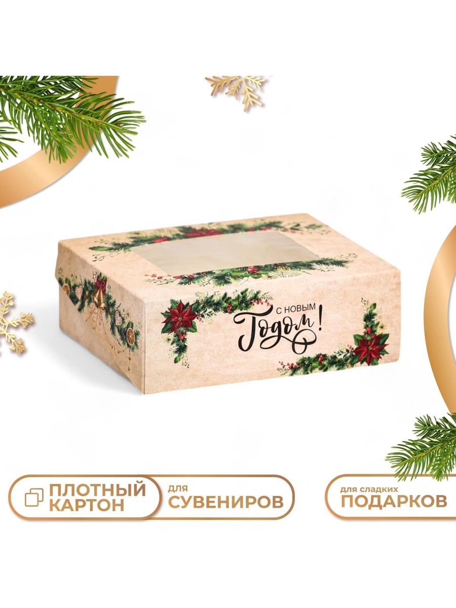 Коробка подарочная новогодняя складная «с новым годом», 10 8 3.5 см. Любой подарок начинается с упаковки. Что может быть трогательнее и волшебнее , чем ритуал разворачивания полученного презента. И именно оригинальная , со вкусом выбранная упаковка выделит ваш подарок из массы других. Высокое качество материала, универсальный дизайн и вместительный объем коробки. Преимущества: яркий дизайн;качественный картон;удобно при транспортировке.Цвет:Бежевый|Форма:Прямоугольная|Плотность, г/м :250|Длина, см:10|Ширина, см:8|Высота, см:3.5|Тематика:Новогодняя|Символ года:Нет|Тематика праздника:Новый год|Материал:Ламинированный картон|Вид:Складные коробки|Размер:Мини (до 10 см)|Окошко:Да|Крышка-дно:Нет|Страна:Россия  развернуть описание ▼