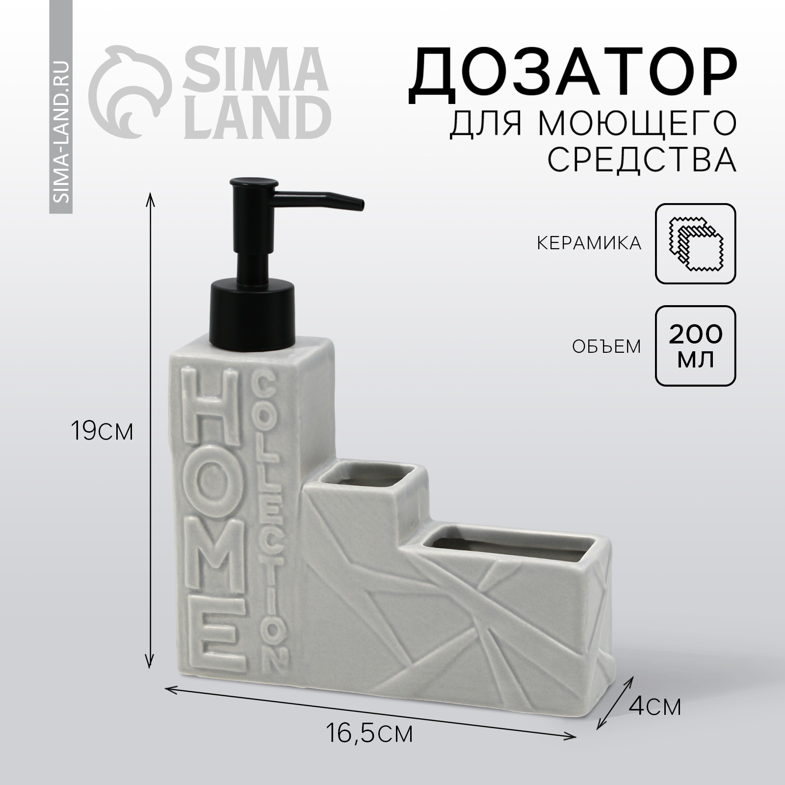 Дозатор для жидкого мыла,серый,16 х 12 х 4 см.. Дозатор для моющего средства- это незаменимая вещь для кухни или ванной. Диспенсер кухонный с подставкой для губки. Дозатор подойдёт для средства для мытья посуды или жидкого мыла. Специальное отделение для губки сэкономит место у раковины и обеспечит более комфортное хранение необходимых вещей на кухне или в ванной. Вы можете залить в дозатор любое средство для мытья посуды или мыло для рук, изделие будет экономно их расходовать. Отличное решение, чтобы поддерживать порядок на кухне. Компактный размер дозатора и продуманное исполнение, делают его идеальным для размещения в зоне мойки на кухне или раковины в ванной. Такой диспенсер будет уместен как дома, в квартире, так и на даче или в саду. Диспенсер для жидких моющих средств с отделением для губки - это отличный выбор для подарка на любой праздник: новый год, 8 марта, 23 февраля, 14 февраля, день рождения, новоселье или просто повод обновить интерьер. Цвет: Серый Количество отсеков: 3 Объём, мл: 200 Объём, мл: 250 tnved: 6912008500 Материал: Керамика Наличие губки/щётки: Нет Дисплей: Нет Настенные: Нет Тип: Дозатор (диспенсер) Способ заправки: Наливной Механизм управления: Ручной  развернуть описание ▼