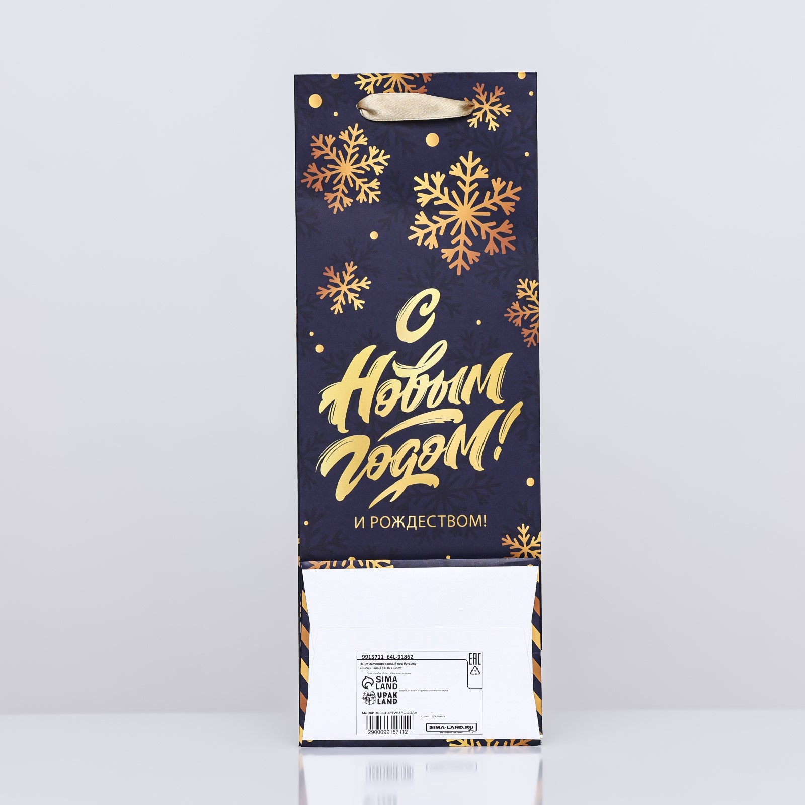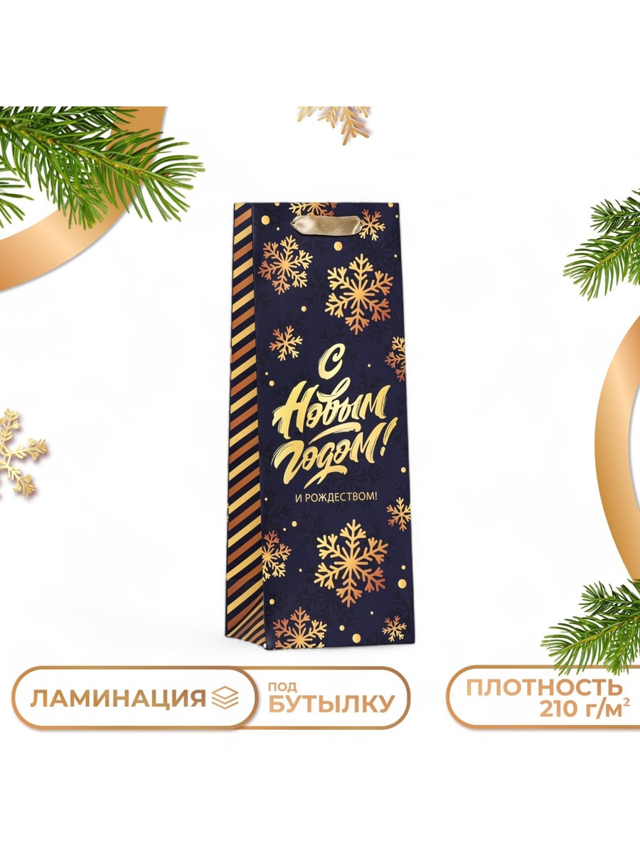 Пакет подарочный новогодний ламинированный под бутылку «с новым годом», 13 36 10 см. Пакет под бутылку - стильное и практичное аксессуарное решение для транспортировки и хранения бутылок напитков. Доступен в разнообразных цветах, что позволяет выбрать оптимальный вариант под ваш стиль или событие. Идеально подходит для вина, шампанского, воды и других бутылок разного размера. Защищает бутылку от ударов и температурных колебаний, сохраняя качество напитка. Удобные ручки и прочные материалы делают его отличным выбором для подарков или повседневного использования.Цвет:Золотистый|Цвет:Синий|Для кого:Унисекс|Плотность, г/м :210|Рекомендуемая нагрузка, кг:3|Тематика:Новогодняя|Вид упаковки:Пакет бумажный|Вид упаковки:Пакет подарочный|Рисунок:Да|Символ года:Нет|Тематика праздника:Новый год|Тематика праздника:Рождество|Материал:Бумага|Отделка пакета:Декор|Отделка пакета:Ламинация|Расширение:Боковая складка|Вид ручки:Ручка-лента|Форма пакета:Вертикальный|Особенности:Креативный|Особенности:Под бутылку|Страна:Китай  развернуть описание ▼