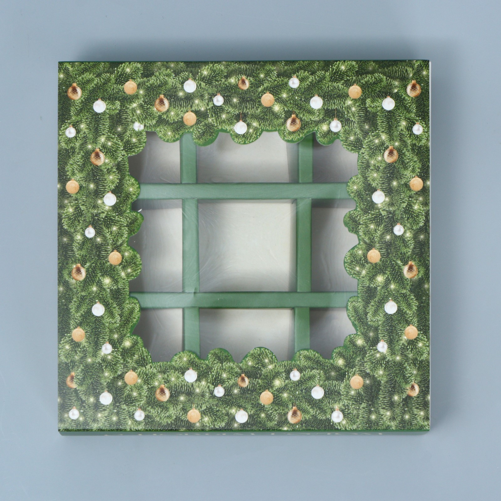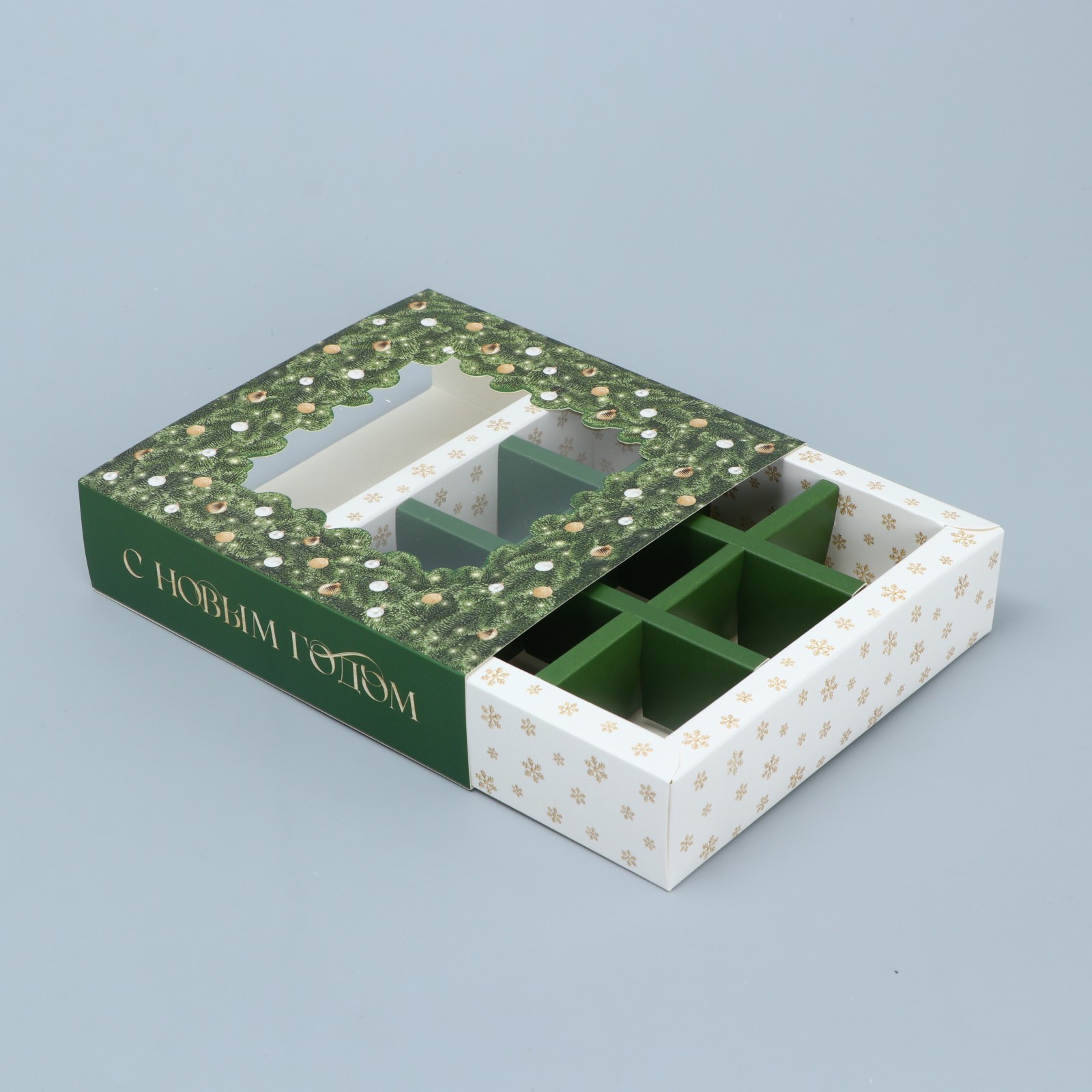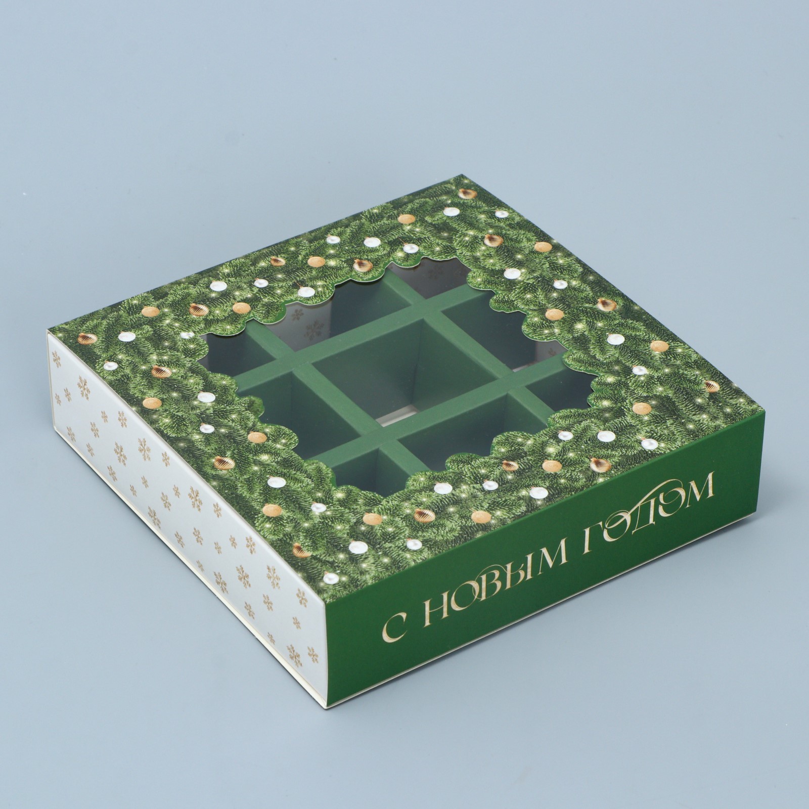 Коробка под 9 конфет с ячейками «с новым годом» 14.5 х 14.5 х 3.5 см. Цвет:Зелёный|Форма:Квадратная|Плотность, г/м :250|Длина, см:14.5|Ширина, см:14.5|Высота, см:3.5|Количество ячеек:9|Тематика:Новогодняя|Символ года:Нет|Тематика праздника:Новый год|Материал:Картон|Вид:Складные коробки|Размер:Малый (11-17 см)|Страна:Китай  развернуть описание ▼