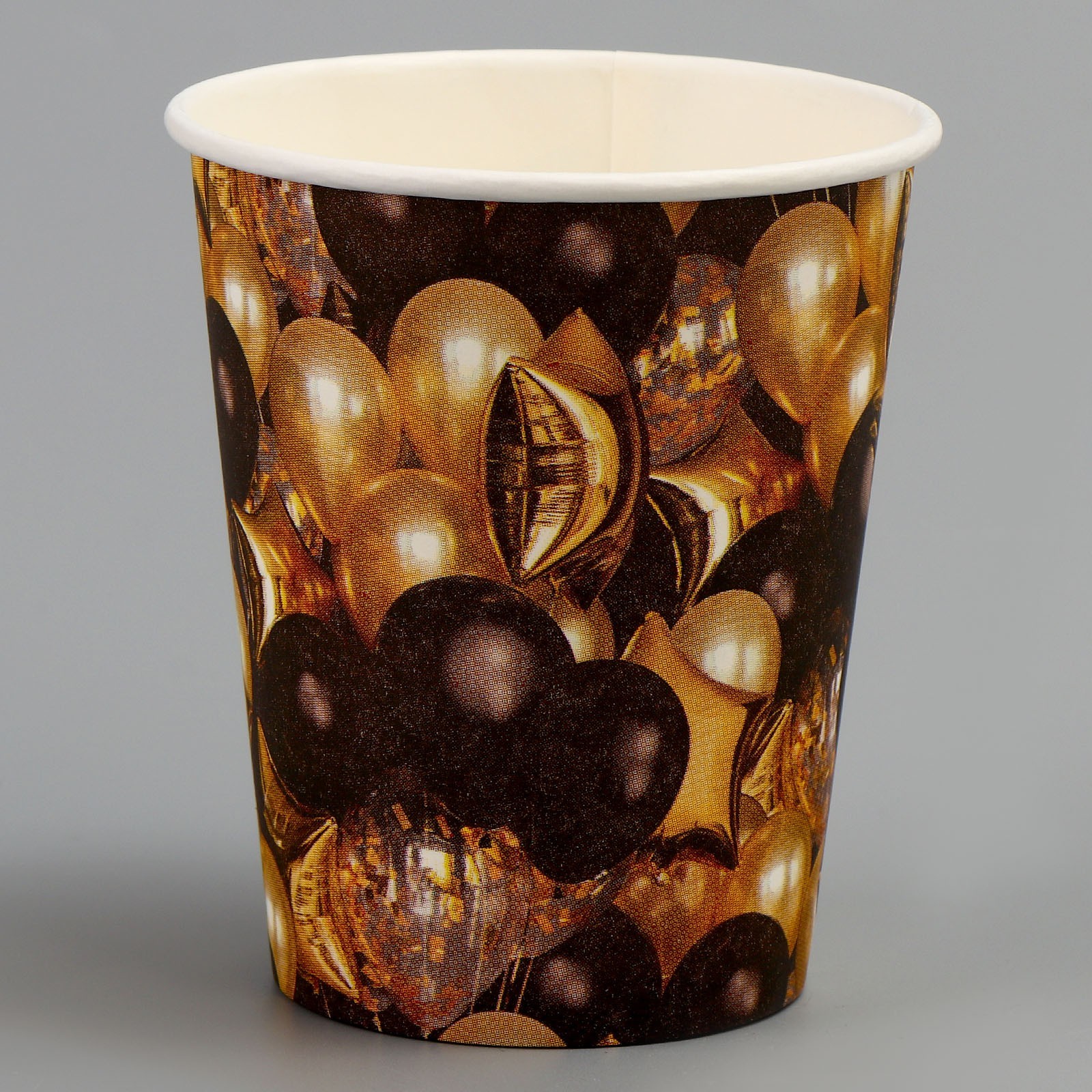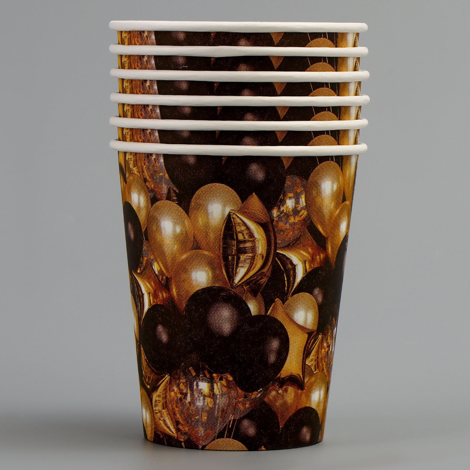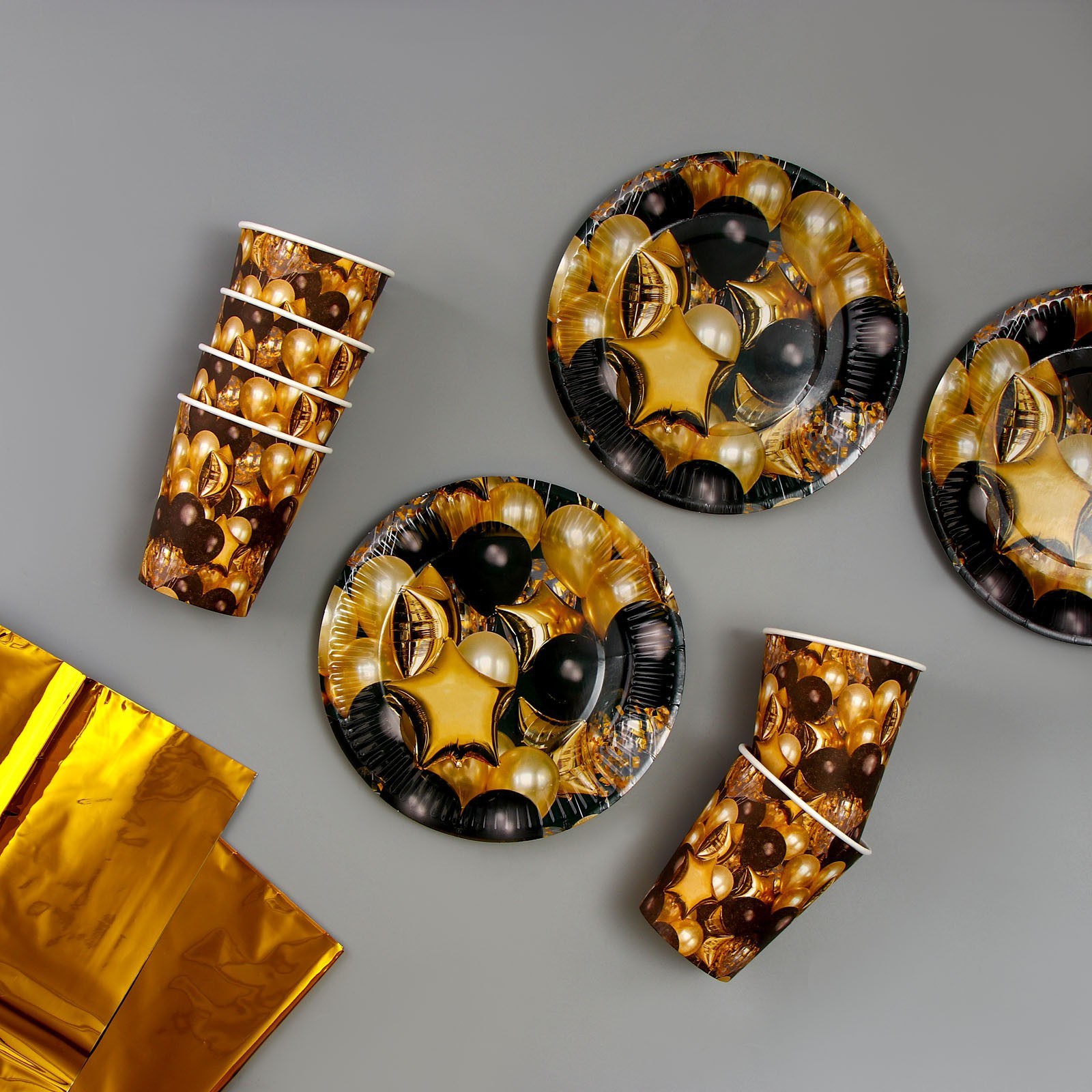 Набор бумажной посуды одноразовый чёрное золото! шары»: 6 тарелок, 6 стаканов, скатерть