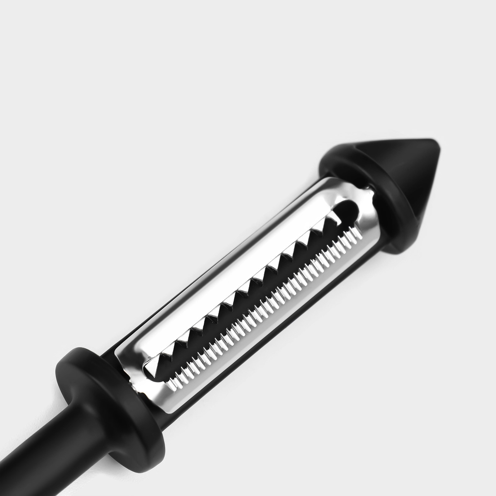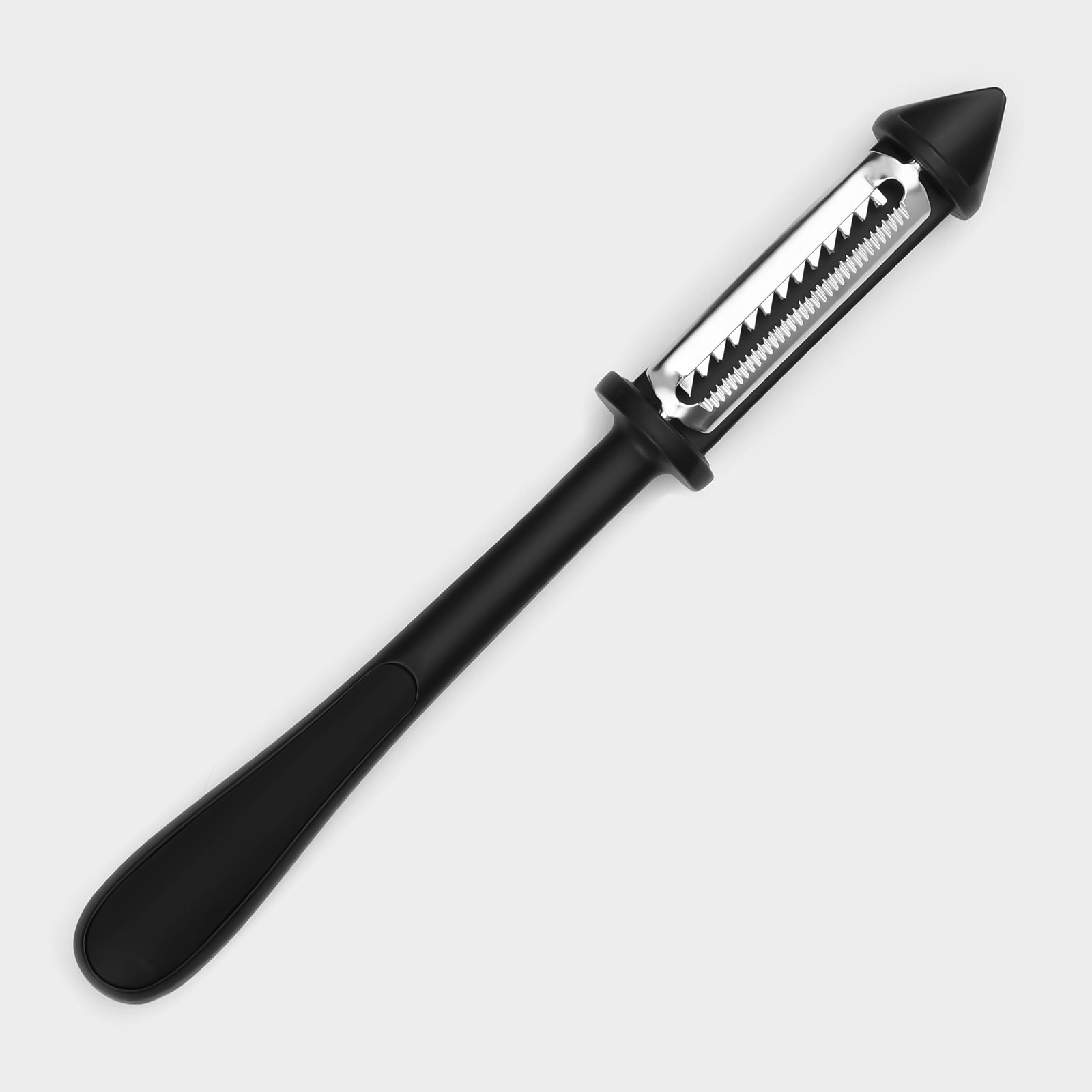 Овощечистка magistro vantablack, 18,5x2 см, многофункциональная, цвет чёрный. Кухня современной хозяйки наполнена различными приборами, облегчающими процесс приготовления пищи. Один из них – ручная овощечистка. Овощечистка подходит для снятия кожуры с фруктов, овощей, корнеплодов, а также для нарезки продуктов на тонкие слайсы. Овощечистка проста в применении, не требует много места для хранения, легко моется, долговечна. Рекомендации по использованию: При использовании овощечистки двигайте нож по направлению от плода, держа его под углом примерно 20 градусов. Позвольте лезвию зацепиться за кожуру, не нужно давить на плод. Позволяет чистить лук без слез - при чистке лука всегда начинайте от корешка и двигайте нож вниз. Материал ручки: Пластик Материал: Пластик Материал: Коррозионно-стойкая сталь Можно мыть в посудомоечной машине: Да Материал лезвия: Нержавеющая сталь Тип: Вертикальная  развернуть описание ▼