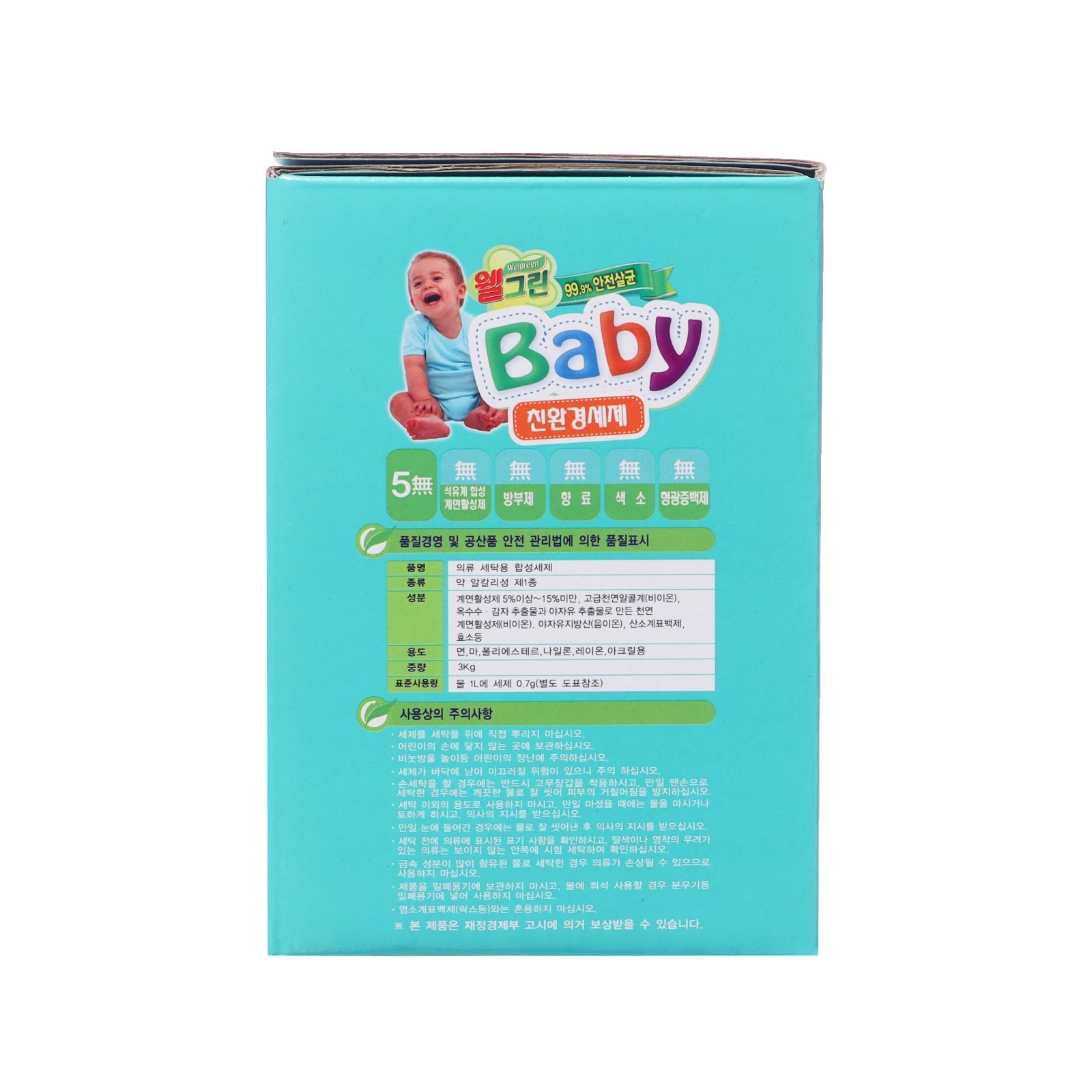 Стиральный порошок welgreen baby для стирки детского белья, 3 кг. Минимально воздействует на чувствительную кожу за счет ПАВ натурального происхождения из картофеля, кукурузы и кокоса. Подходит для стирки хлопка, льна и синтетических тканей, а также нижнего белья и детской одежды. Позволяет экономить воду благодаря пониженному пенообразованию. С легким ароматом. Дарит белью свежий и приятный запах. Подходит для стирки как белого, так и цветного белья. Благодаря особой структуре в виде микропудры полностью растворяется даже в холодной воде, оставляя при этом воду прозрачной. Для ручной и автоматической стирки. Не содержит химических веществ - синтетических ПАВ на основе нефти, консервантов, красителей, ароматизаторов и флуоресцентных отбеливателей. На 99, 9% удаляет бактерии с одежды. parts count: 0 Вес, г/Объём, мл: 3000 : 0 Вид средства: Порошок Особенности средства: Без сульфатов  развернуть описание ▼