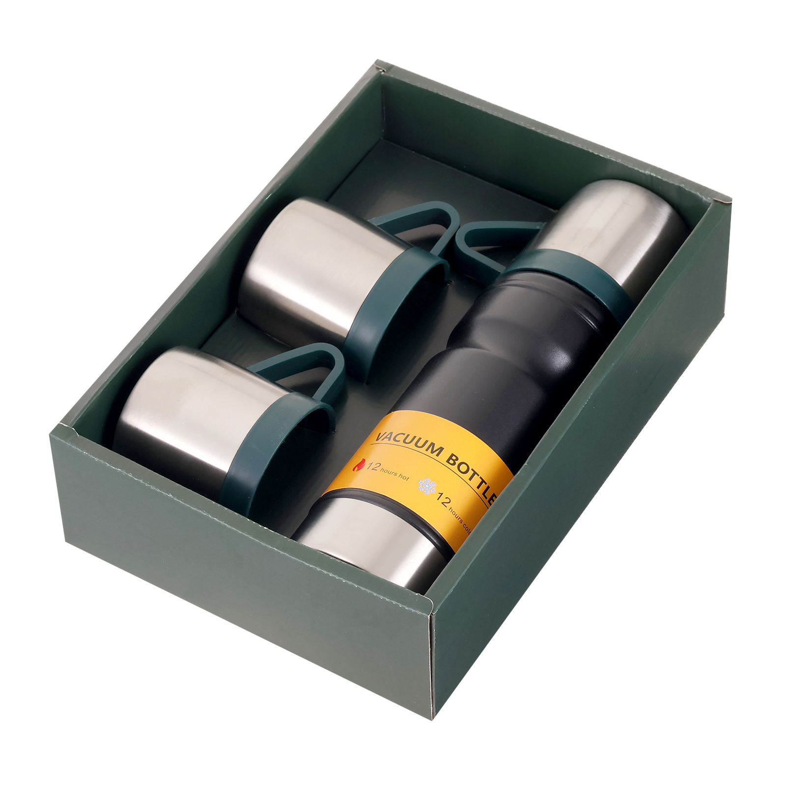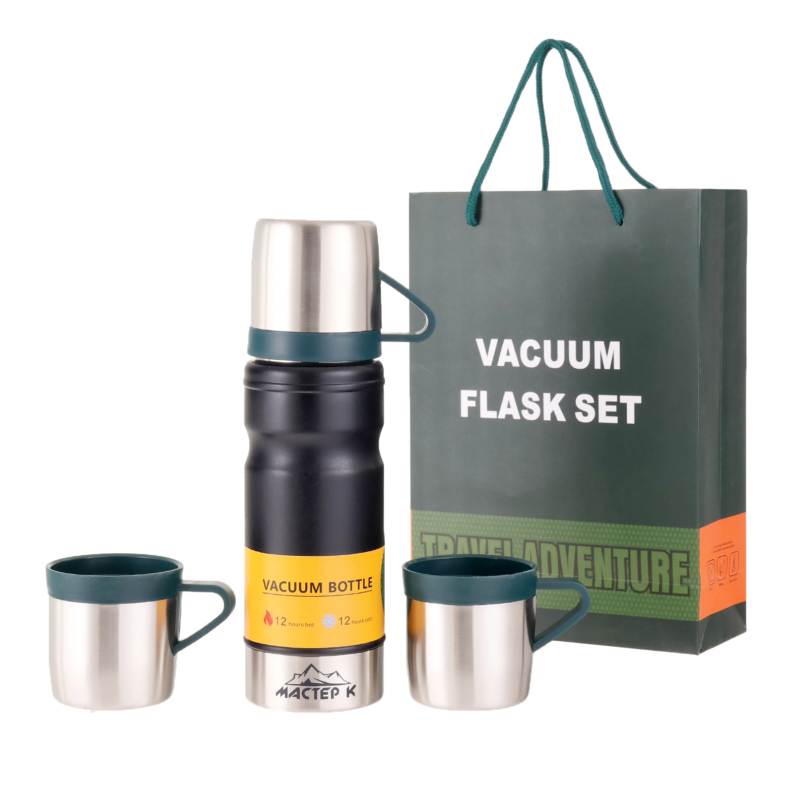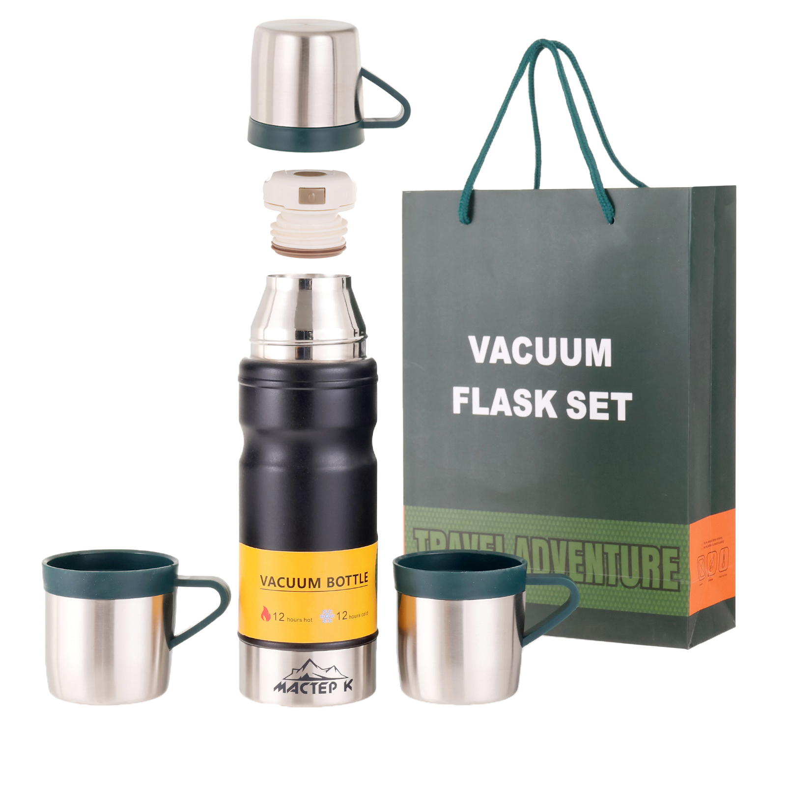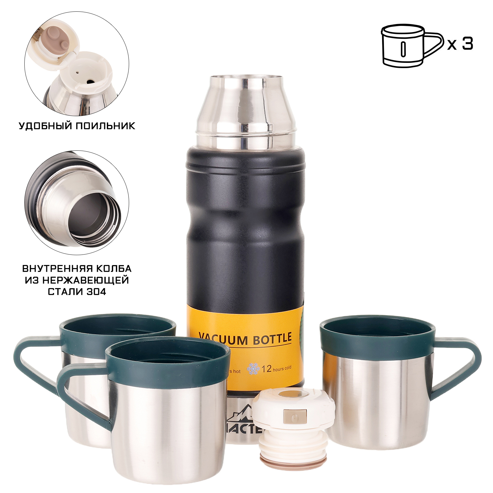 Набор "мастер к": термос 680 мл и 3 кружки, сохраняет тепло 12 ч, черный. Набор "Мастер К" подойдет в качестве подарка для любого человека, который ведет активный образ жизни, часто путешествует или просто любит проводить время в кругу близких и друзей за чашечкой горячего напитка. Этот набор будет особенно актуален для любителей зимних видов спорта, туристических походов и кемпингов. Также это отличный выбор для офисных работников, которые хотят иметь возможность наслаждаться горячим кофе или чаем в течение всего дня! Изготовлен из высококачественной нержавеющей стали с двойными стенками, что обеспечивает длительное сохранение тепла вашего кофе или чая до 12 часов, а его противоударный корпус, выполненный в виде стандартной бутылки, делает его прочным и стильным. Термос оснащён поильником, что позволяет легко и удобно наливать ваш любимый напиток, поддерживая его температуру и предотвращая проливы. Нельзя мыть в посудомоечной машине и нагревать в микроволновой печи. Термос "Мастер К" - это стильный аксессуар и отличный подарок на новый год, другу, подруге, брату, сестре, девушке, папе, маме, мужу, жене, бабушке и дедушке на день рождения, 23 февраля, 8 марта, 14 февраля. Цвет: Чёрный Для кого: Унисекс Объём, л: 0.68 Время сохранения тепла/холода, ч: 12 tnved: 9617000001 Материал корпуса: Пластик Тип горлышка: Стандартное Назначение: Для напитков Материал колбы: Металл Особенности: С дополнительной ёмкостью Особенности: С клапаном Особенности: С кнопкой  развернуть описание ▼