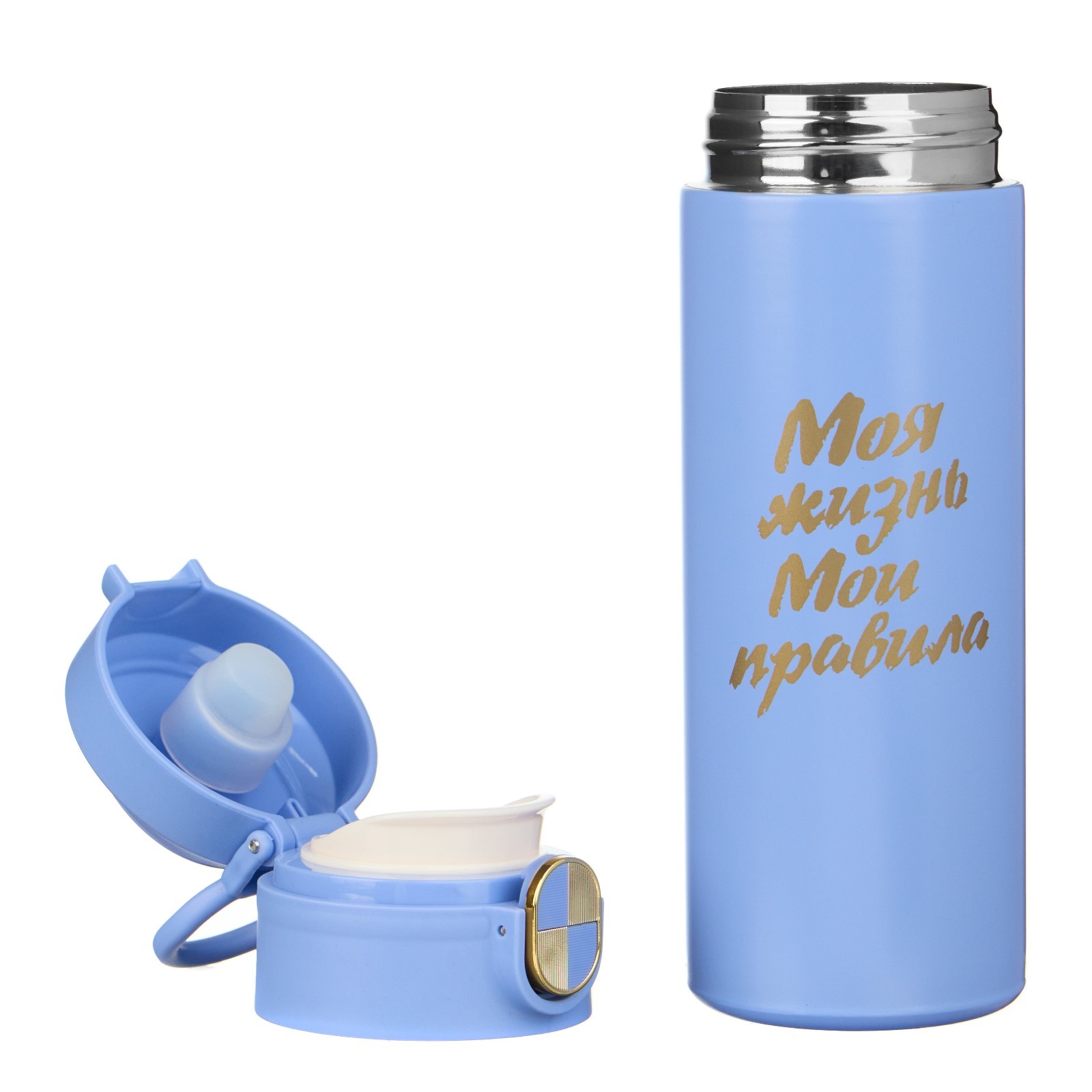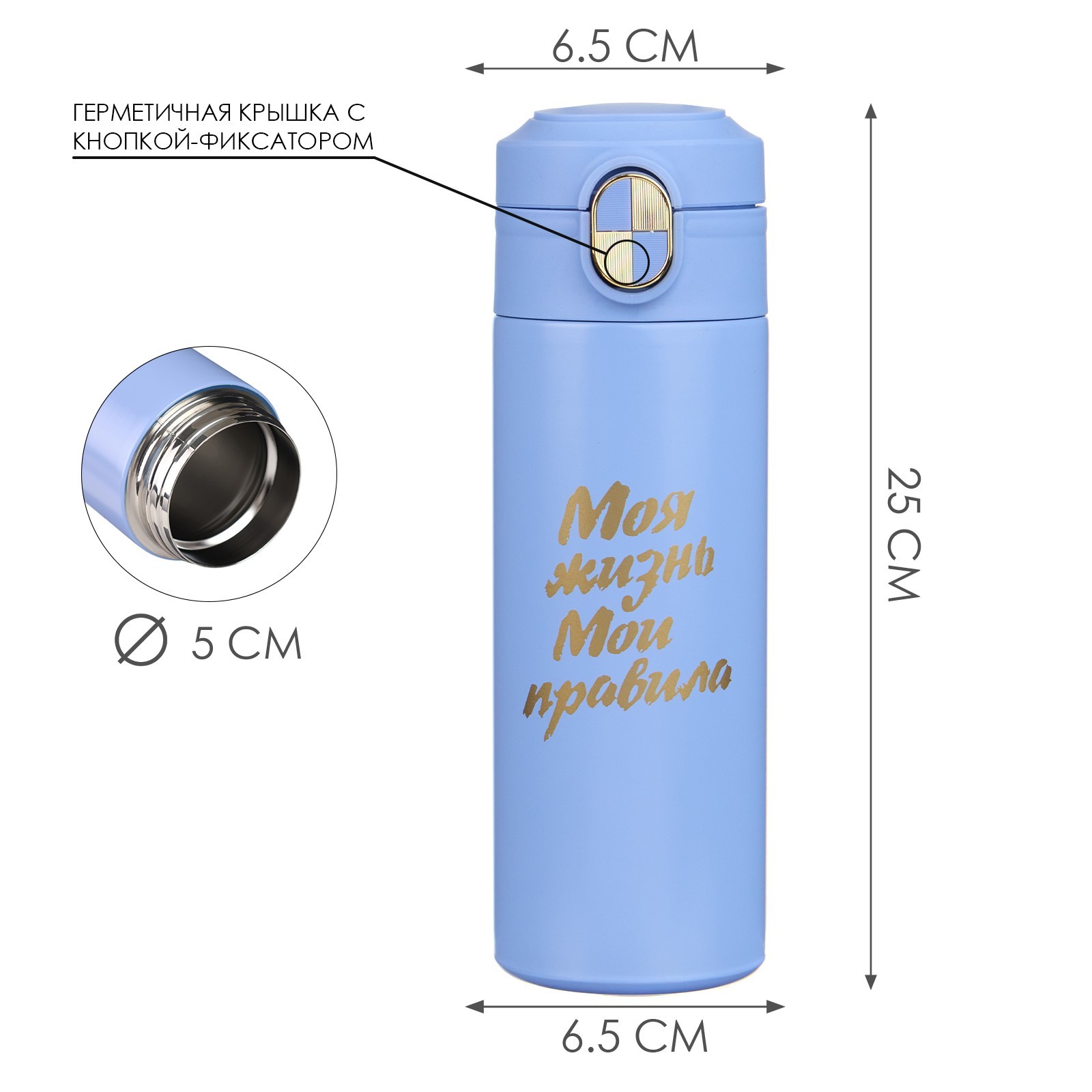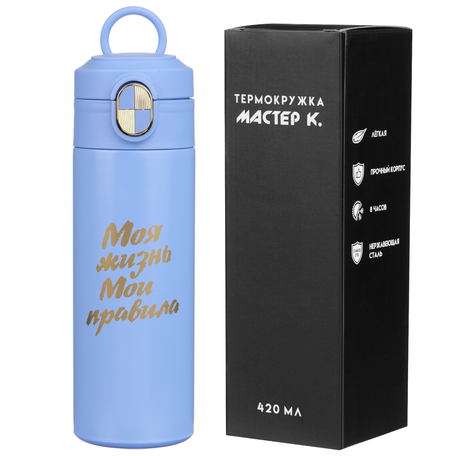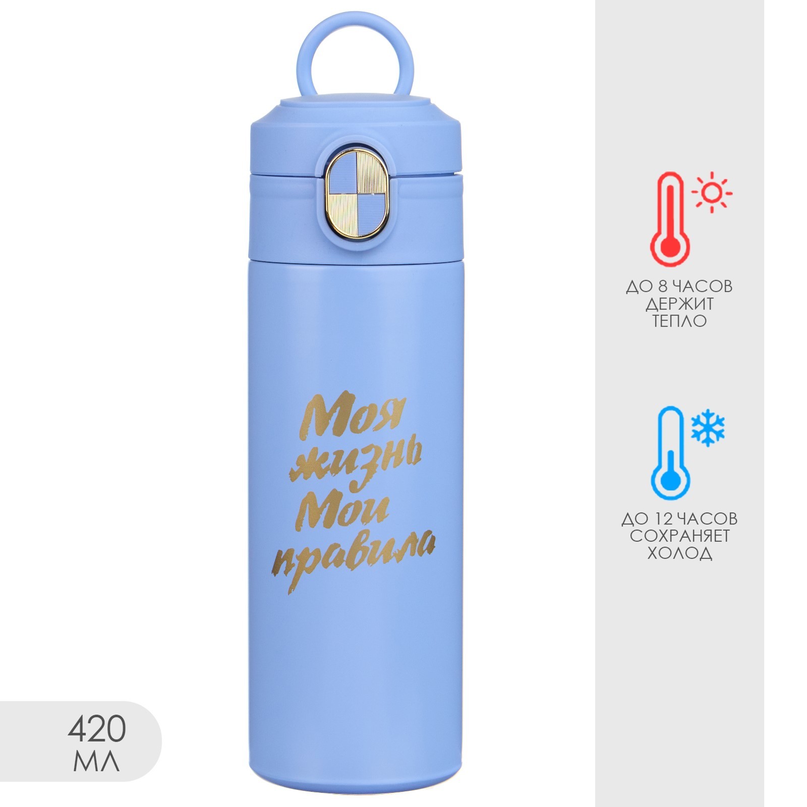 Термокружка, 420 мл, simple "моя жизнь - мои правила", сохраняет тепло до 8 ч. Термокружка для кофе и чая "Моя жизнь - мои правила" идеальна для офиса, автомобиля, длительных прогулок и детям в школу. Благодаря специальному покрытию надежно лежит в руке. Термокружка - это стильный аксессуар и отличный подарок на новый год, другу, подруге, брату, сестре, девушке, папе, маме, мужу, жене, бабушке и дедушке на день рождения, 23 февраля, 8 марта, 14 февраля. Термокружка сделана из нержавеющей стали марки 304, сконструирована по вакуумной технологии, с двойной стенкой, следовательно, долго держит тепло и не проливается. Оснащена откидывающейся крышкой, изготовленной из экологичного пищевого пластика. На дне термокружка имеет специальную прорезиненную основу, предотвращающую царапины на поверхностях. Особенности: Можно открывать и закрывать одной рукойУдобное горлышко (поильник)Нескользящее дноСтавится в автомобильный подстаканникОткрывается с помощью нажатия100% защита от протеканияСтильный дизайн, приятна на ощупьСохраняет тепло или холод до 8 часовДвойные стенки из нержавеющей сталиПеред первым применением обдайте внутреннюю колбу кипятком. После того, как нальёте горячий напиток, через несколько секунд откройте кружку, выпустите пар и снова закройте. Так напиток дольше сохранит температуру. Нельзя мыть в посудомоечной машине и нагревать в микроволновой печи. Цвет: Голубой Объём, л: 0.42 Время сохранения тепла/холода, ч: 8 Объём, мл: 420 tnved: 7323930000 Крышка: Нет Материал: Пластик Особенности: С кнопкой  развернуть описание ▼