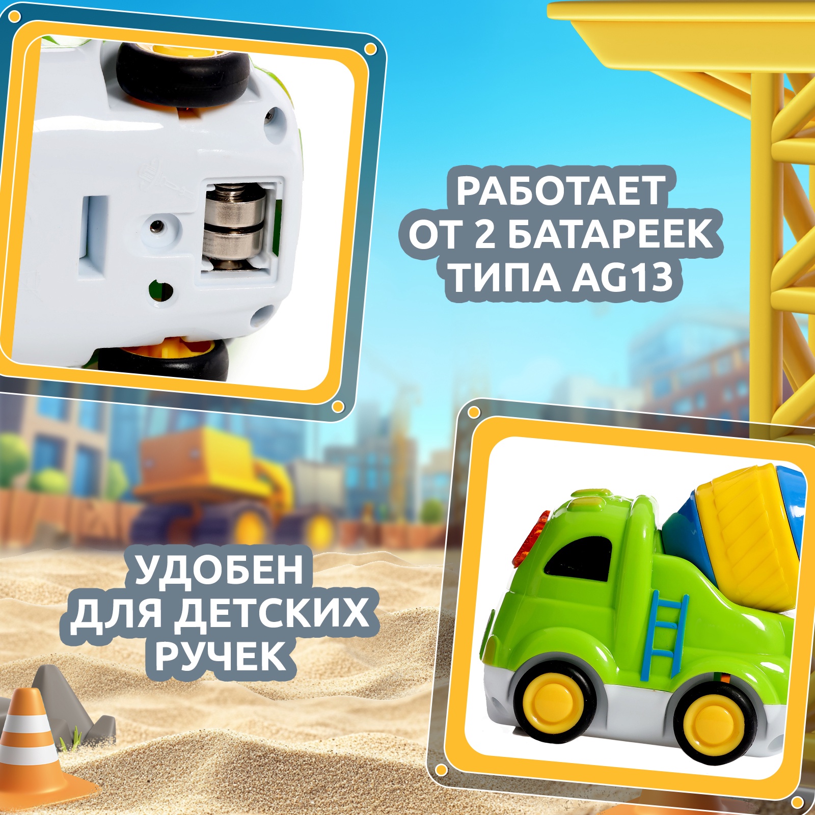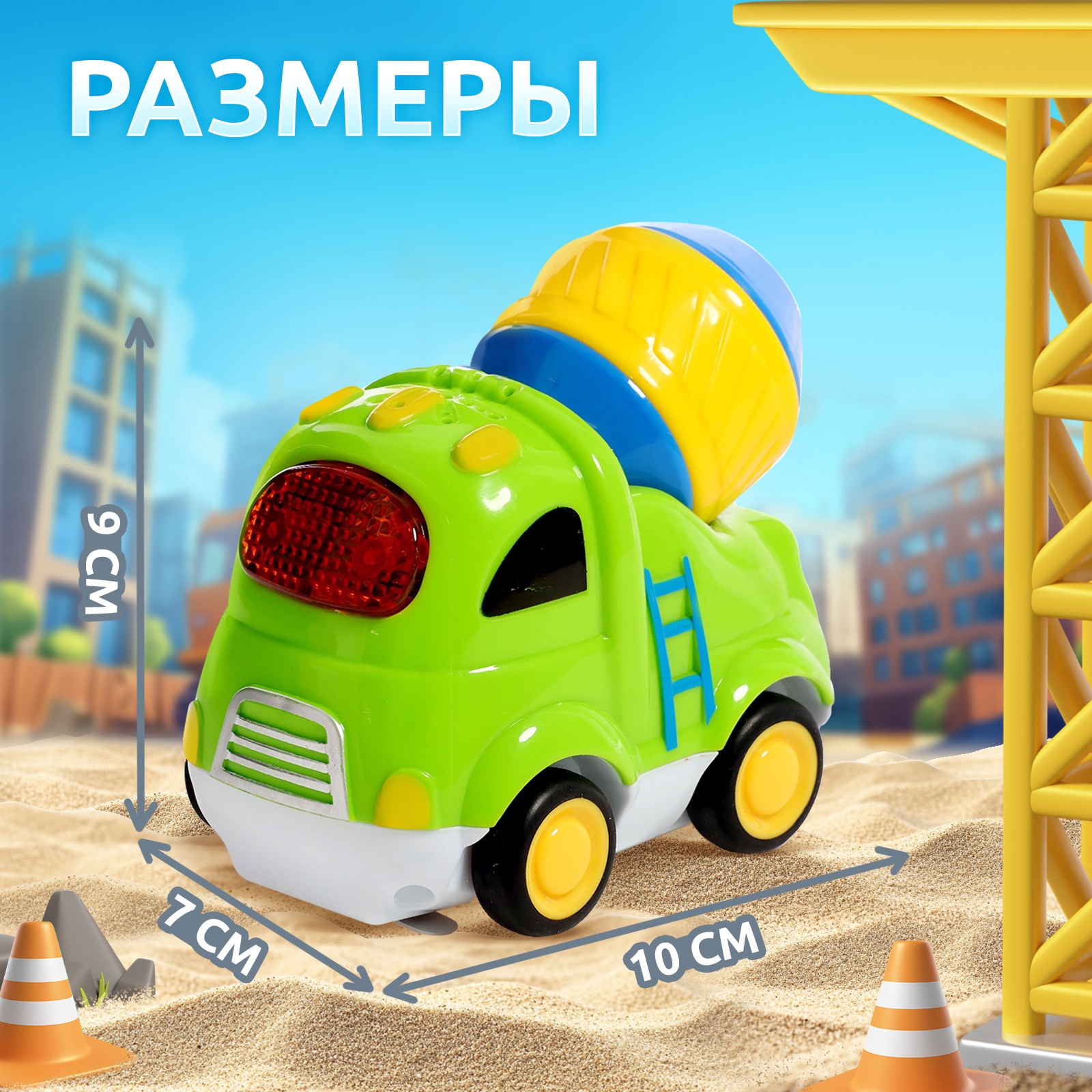 Музыкальная машинка «городские приключения: бетономешалка», звук, свет. Музыкальная машинка «Городские приключения: Бетономешалка» разработана специально для малышей от 3 лет. Игрушка привлечёт внимание трогательным дизайном и надолго займёт малыша. Особенности игрушки Игрушка воспроизводит весёлые песенки и звуки настоящего транспорта.Озвучка на русском языке.Есть световые эффекты: лобовое стекло светится красным цветом.Игрушку небольшого размера удобно держать в маленькой ручке.Размеры бетономешалки: 9 7 10 см.Для работы необходимы 2 батарейки типоразмера AG13.Чем полезны занятия с музыкальной игрушкой Взаимодействуя с игрушкой, малыш тренирует слуховое восприятие, моторику и координацию движений, а также мышление и воображение. Тип питания:Без источника питания|Набор:Нет|Вид транспорта:Бетоносмеситель (Бетономешалка)|Назначение транспорта:Строительный|Цвет:Зелёный|Для кого:Для мальчика|Возраст:От 3 лет|Вид упаковки:Коробка картонная с PVC|Материал:Пластик|Русская озвучка:Да|Дополнительные функции:Звуковые эффекты|Дополнительные функции:Светящаяся|Типоразмер батареек:LR44 (V13GA, AG13, LR1154, SR44)|Тип механизма:Без механизма|Среда перемещения транспорта:Наземный транспорт|Тематика назначения:Специальный транспорт|Страна:Китай  развернуть описание ▼