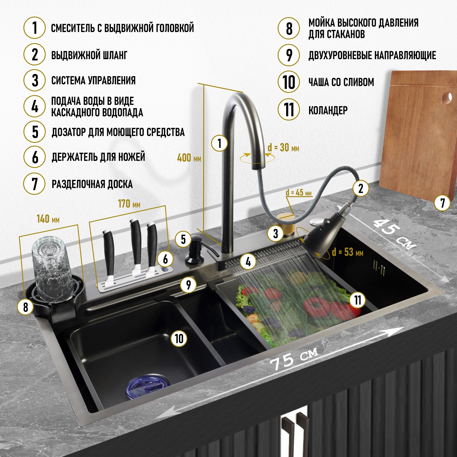 Кухонная мойка zein m02, s=3.0 и 0.7 мм, смеситель, корзины, разделочная доска, сифон, графит. Многофункциональная кухонная мойка ZEIN изготовлена из нержавеющей стали с нано покрытием. Основным преимуществом материала является высокая устойчивость к сколам, царапинам, перепадам температур. Такая сталь не окрашивается, не ржавеет и ценится своей долговечностью. Стальной корпус врезной мойки имеет толщину рабочей поверхности – 3 мм и чаши - 0,8 мм. Глубина чаши составляет 19 см - это оптимальный размер, благодаря чему вода не разбрызгивается за пределы мойки. Также, на дне расположен небольшой уклон, который позволяет воде не задерживаться и сразу стекать в слив. Данная мойка имеет три отверстия для установки дополнительного оборудования. В комплекте уже идут ополаскиватель стаканов и дозатор для моющего средства. Третье отверстие можно использовать для установки крана от фильтра для питьевой воды. Для ухода за мойкой надо быть внимательным. При контакте нержавеющей стали с хлорсодержащими жидкостями, парами и прочими реагентами, покрытие защитного слоя легко разрушается. Однако, данный материал мойки хорошо переносит воздействие сильных кислот и щелочей. Неповторимый дизайн данной модели восхищает своей оригинальностью и отлично впишется в любой интерьер. Мойка отвечает высоким требованиям и стандартам качества. Комплектация: Смеситель со встроенным выдвижным шлангом и несколькими режимами подачи воды;2 корзины (со сливом и коландер - с отверстиями);Разделочная доска;Дозатор для моющего средства;Ополаскиватель для стаканов;Режим водопад;Ящик для ножей;Сифон с переливом.Тип установки мойки:Врезная|Длина, мм:550|Ширина, мм:750|Гарантийный срок, мес.:12|Глубина чаши, мм:190|Форма мойки:Прямоугольная|Цвет:Графитовый|Конфигурация:Одна чаша без крыла|Материал мойки:Нержавеющая сталь|Перелив:Да|Вид перелива:Прямоугольный|Поверхность:Матовая|Диаметр выпуска:3 1/2|Сифон в комплекте:Да|Страна:Китай  развернуть описание ▼