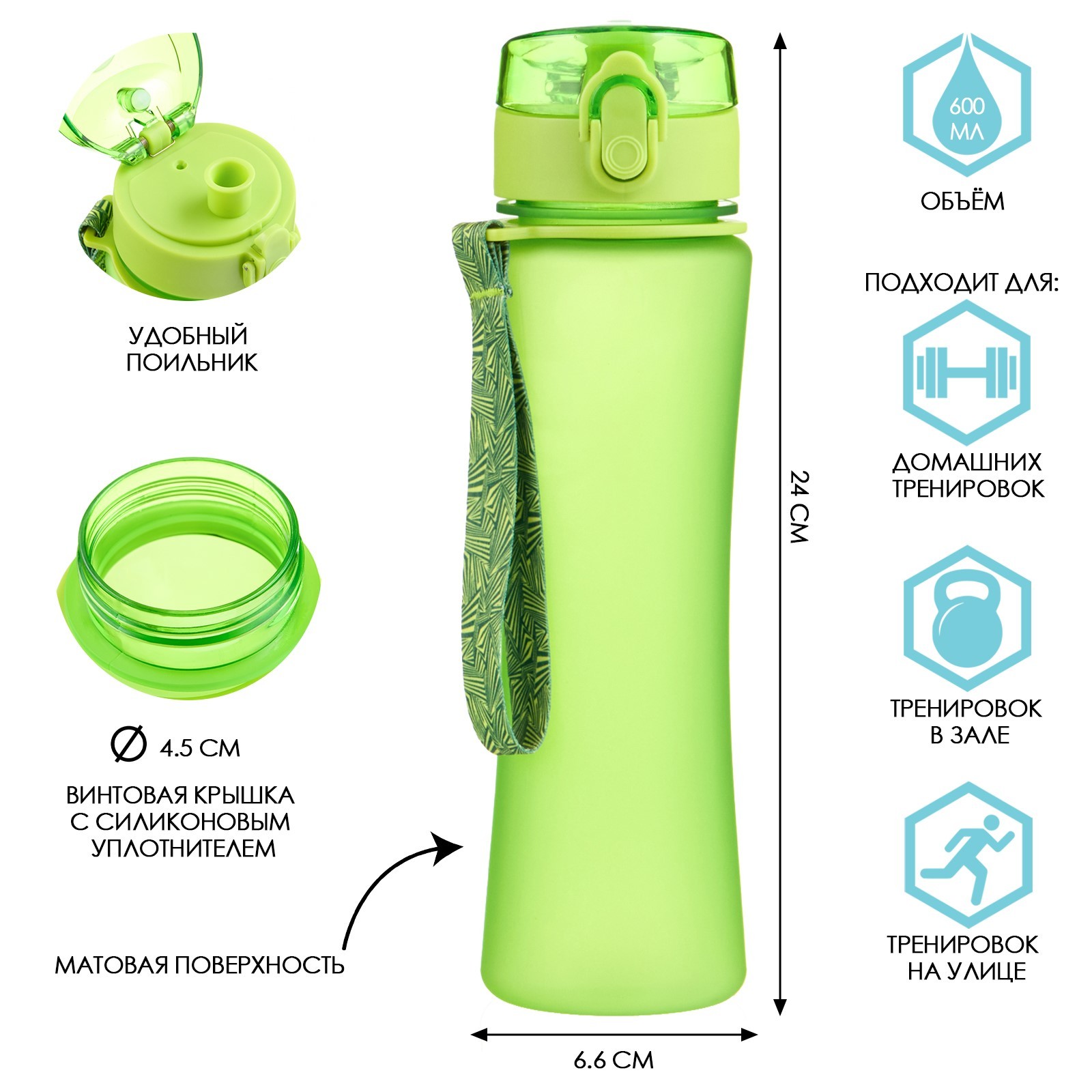 Бутылка для воды, с поильником, 600 мл, зелёная. Спортивная бутылка для воды идеально подойдет для всех, кто ведет активный образ жизни. Это стильный аксессуар, который не только позволит вам утолить жажду, но и станет незаменимым атрибутом для занятий спортом, туризма и пеших прогулок. С этой спортивной бутылкой вы всегда будете иметь возможность поддерживать свой организм правильным уровнем водного баланса. Она станет вашим верным спутником как на тренировках, так и в повседневной жизни. Благодаря ее удобной форме и вместительности в 600 мл, она легко помещается в сумке или рюкзаке. Эта бутылочка для воды идеальна для использования в школе и на спортивных занятиях детей и малышей. Она изготовлена из прочного и экологически чистого пластика, который не повреждается при активном использовании и позволяет сохранять воду свежей и чистой на протяжении всего дня. Бутылка оборудована герметичной крышкой с поильником и удобным ремешком, который позволяет носить ее с собой или крепить к сумке или рюкзаку. Подарите эту бутылку маме, бабушке, папе, другу, подруге, сестре на любой праздник – она станет полезным и практичным подарком для здорового образа жизни! Цвет: Зелёный parts count: 0 Объём, мл: 600 Материал: Пластик Вид: Бутылка Можно мыть в посудомоечной машине: Нет Особенности: На кнопке Особенности: На подвесе Особенности: С поильником  развернуть описание ▼