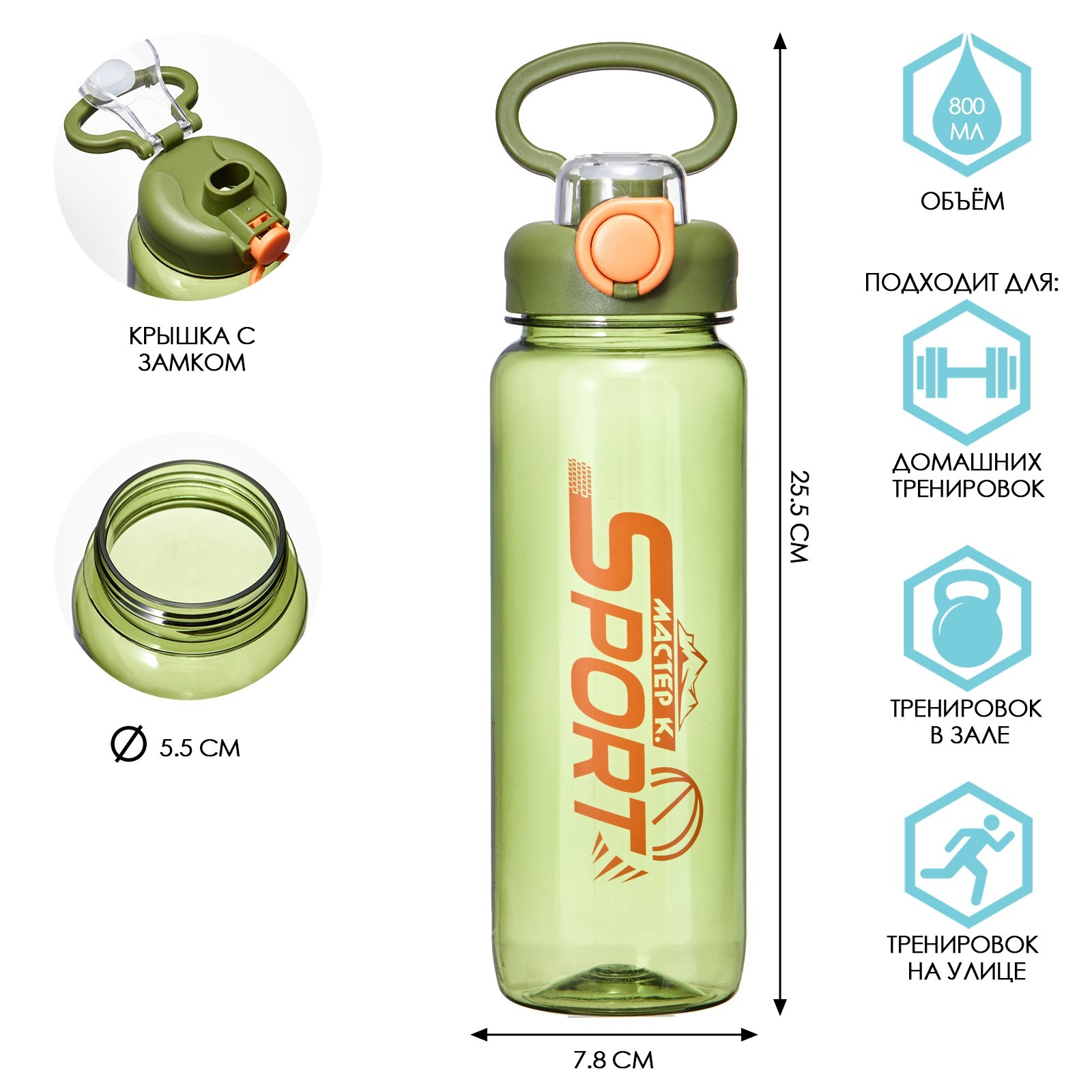 Бутылка для воды, 800 мл, sport, 800 мл, с поильником, зеленая. Спортивная бутылка для воды идеально подойдет для всех, кто ведет активный образ жизни. Это стильный аксессуар, который не только позволит вам утолить жажду, но и станет незаменимым атрибутом для занятий спортом, туризма и пеших прогулок. С этой спортивной бутылкой вы всегда будете иметь возможность поддерживать свой организм правильным уровнем водного баланса. Она станет вашим верным спутником как на тренировках, так и в повседневной жизни. Благодаря ее удобной форме и вместительности в 800 мл, она легко помещается в сумке или рюкзаке. Эта бутылочка для воды идеальна для использования в школе и на спортивных занятиях детей и малышей. Она изготовлена из прочного и экологически чистого пластика, который не повреждается при активном использовании и позволяет сохранять воду свежей и чистой на протяжении всего дня. Бутылка оборудована герметичной крышкой с поильником и держателем, который позволяет носить ее с собой или крепить к сумке или рюкзаку. Подарите эту бутылку маме, бабушке, папе, другу, подруге, сестре на любой праздник – она станет полезным и практичным подарком для здорового образа жизни! Цвет: Зелёный Объём, мл: 800 Материал: Пластик Вид: Бутылка Особенности: На подвесе Особенности: С поильником  развернуть описание ▼