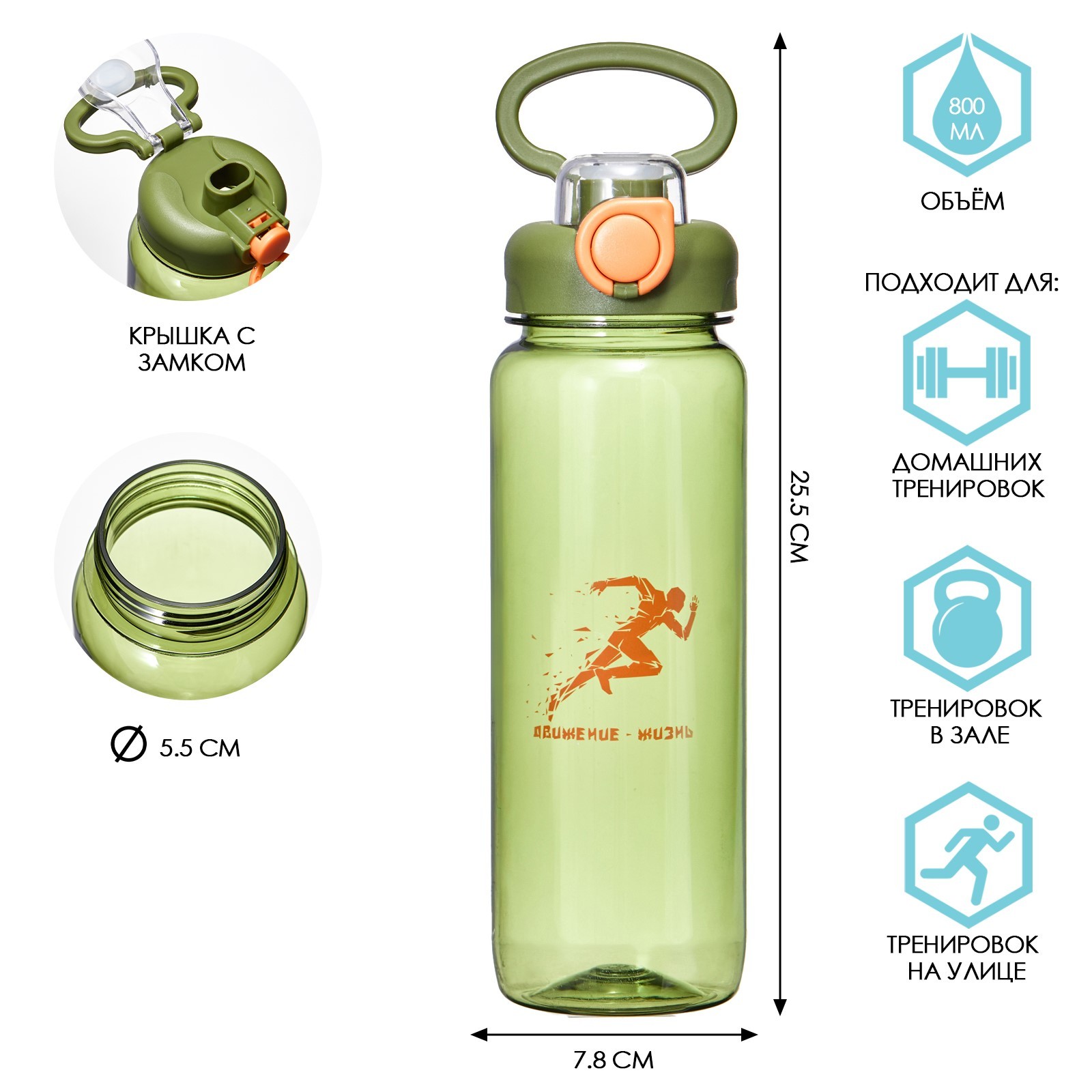 Бутылка для воды, 800 мл, "движение - жизнь", с поильником, зеленая. Спортивная бутылка для воды идеально подойдет для всех, кто ведет активный образ жизни. Это стильный аксессуар, который не только позволит вам утолить жажду, но и станет незаменимым атрибутом для занятий спортом, туризма и пеших прогулок. С этой спортивной бутылкой вы всегда будете иметь возможность поддерживать свой организм правильным уровнем водного баланса. Она станет вашим верным спутником как на тренировках, так и в повседневной жизни. Благодаря ее удобной форме и вместительности в 800 мл, она легко помещается в сумке или рюкзаке. Эта бутылочка для воды идеальна для использования в школе и на спортивных занятиях детей и малышей. Она изготовлена из прочного и экологически чистого пластика, который не повреждается при активном использовании и позволяет сохранять воду свежей и чистой на протяжении всего дня. Бутылка оборудована герметичной крышкой с поильником и держателем, который позволяет носить ее с собой или крепить к сумке или рюкзаку. Подарите эту бутылку маме, бабушке, папе, другу, подруге, сестре на любой праздник – она станет полезным и практичным подарком для здорового образа жизни! Цвет: Зелёный Объём, мл: 800 Материал: Пластик Вид: Бутылка Особенности: С поильником Особенности: На подвесе  развернуть описание ▼