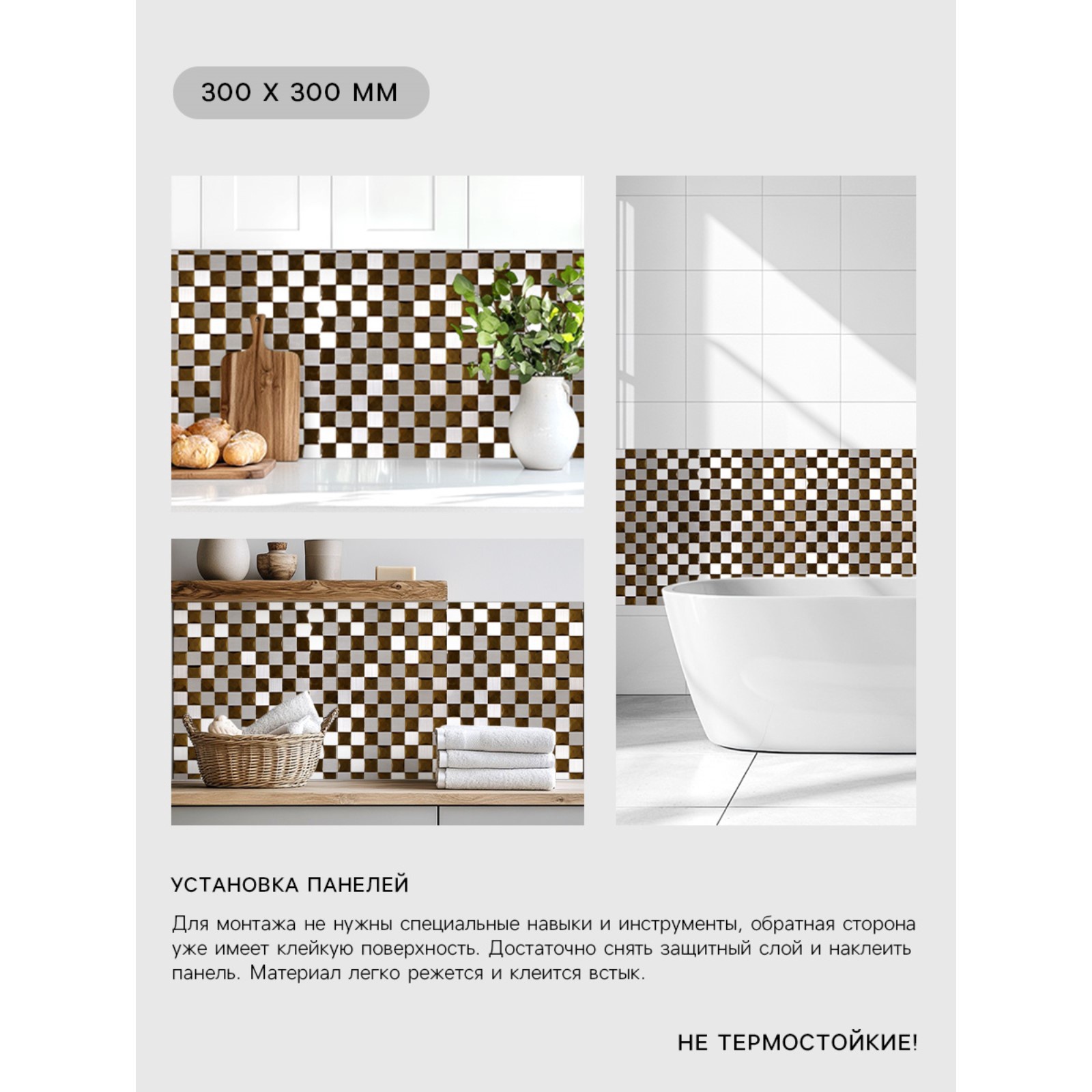 Панель пвх самоклеящаяся take it easy «мозаика клетка», 300 300 мм, цвет серо - золотой. Самоклеющиеся ПВХ - панели: решение для быстрого ремонта Представляют собой простой и удобный материал для быстрой отделки помещений. Используют для обновления интерьера квартир, офисов и коммерческих объектов. Данный облицовочный материал позволяет быстро преобразить пространство, создать уют и освежить отделку стен. Преимущества самоклеющихся панелей Простота установки: монтаж панелей не требует специальных инструментов и опыта, так как одна сторона покрыта клеевым слоем.Влагостойкость: панели устойчивы к воздействию влаги, их можно успешно применять в кухнях и ванных комнатах.Легкий уход: поверхность панелей легко очищается мягкой губкой с нейтральными моющими средствами.Экономия времени: благодаря простоте наклеивания монтаж занимает минимум времени, позволяя быстро завершить ремонтные работы.ПрименениеРекомендации по установке и эксплуатации Не применяйте панели в местах с прямым контактом воды, таких как пол или зона готовки на кухне.Перед укладкой очистите стену от пыли и грязи, обработав спиртосодержащим раствором для удаления жирных пятен.Используйте дополнительный клей для ПВХ для усиления фиксации, особенно на сложных поверхностях.Избегайте чрезмерного натяжения при наклейке, иначе возможны деформации.Цвет:Золотистый|Цвет:Серый|Цвет:Разноцветный|Цвет:Серебристый|Длина, см:30|Ширина, см:30|Тематика:Мозаика|Одноцветный:Нет|Подходит для ванной комнаты:Нет|Страна:Китай  развернуть описание ▼
