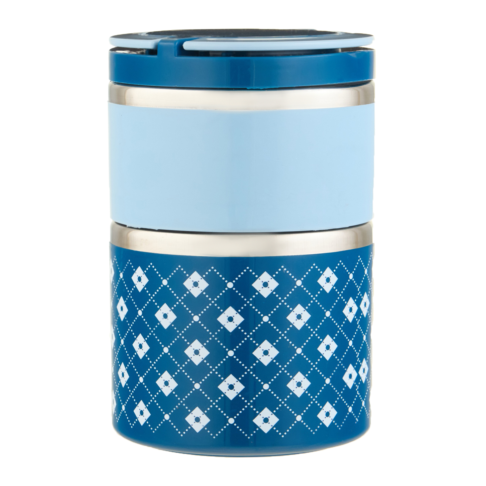 Ланч-бокс, 985 мл, сохраняет тепло 2 ч, 2 уровня.    Цвет: Голубой Форма: Фигурная Объём, л: 0.98 В наборе, шт.: 1 Время сохранения тепла/холода, ч: 2 Объём, мл: 985 Материал: Нержавеющая сталь Герметичная крышка: Да Можно использовать в СВЧ-печи: Нет Форма: Фигурная  развернуть описание ▼