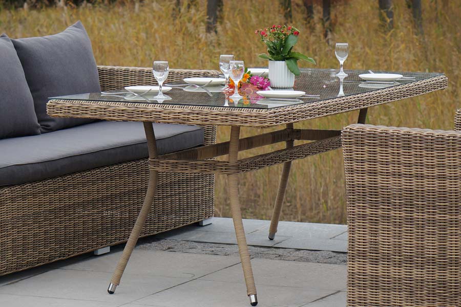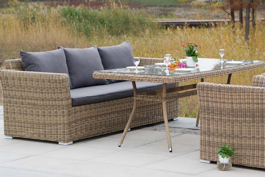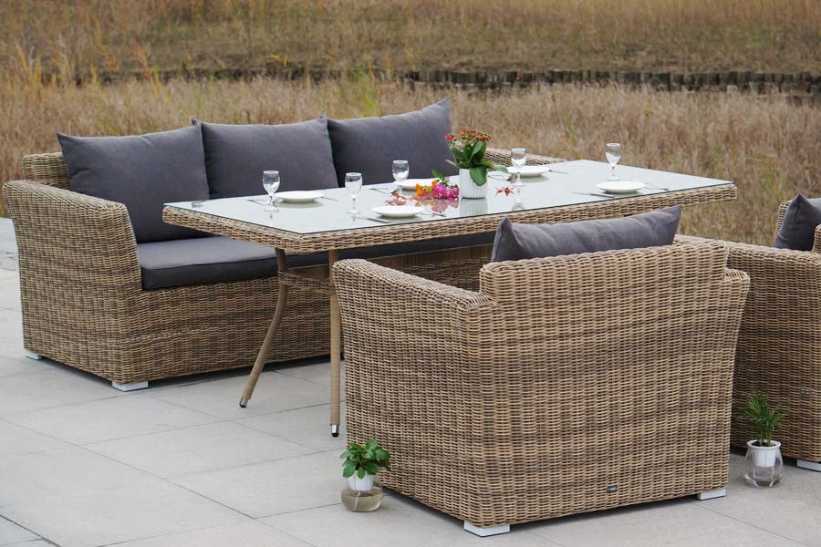 Моккачино, обеденная группа, соломенный цвет. Обеденная группа из искусственного ротанга: 1 трехместный диван, 2 кресла и обеденный стол со стеклянной столешницей. Алюминиевый каркас, круглый искусственный ротанг, ручное плетение. Диван и кресла оснащены подушками со съемными чехлами. Материал каркаса Искусственный ротанг, алюминий Материал подушки полиэстер 100% плотностью 230гр/м2 с влагоотталкивающей пропиткой Вес 115кг