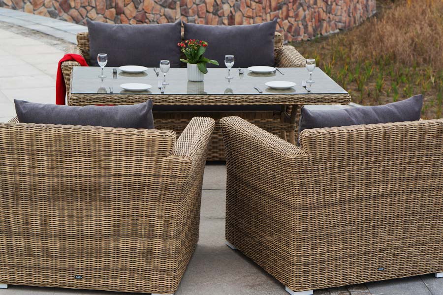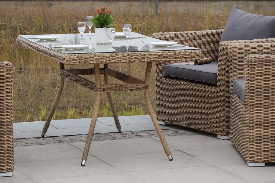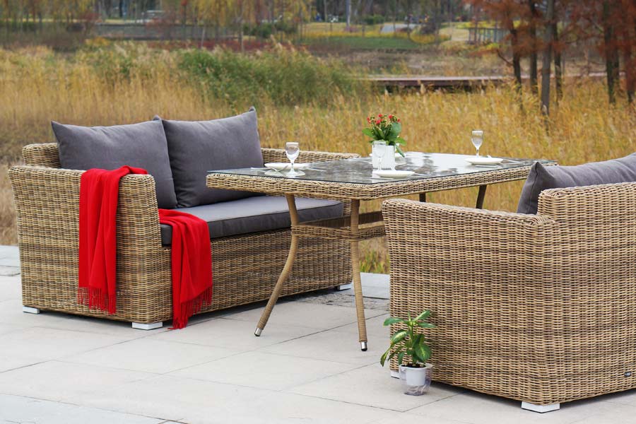 Аффогато, обеденная группа, соломенный цвет. Обеденная группа из искусственного ротанга: 1 двухместный диван, 2 кресла и обеденный стол со стеклянной столешницей. Алюминиевый каркас, круглый искусственный ротанг, ручное плетение. Диван и кресла оснащены подушками со съемными чехлами. Материал каркаса Искусственный ротанг, алюминий Материал подушки полиэстер 100% плотностью 230гр/м2 с влагоотталкивающей пропиткой Вес 103кг