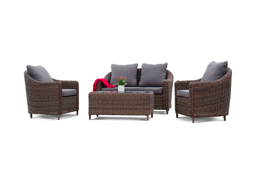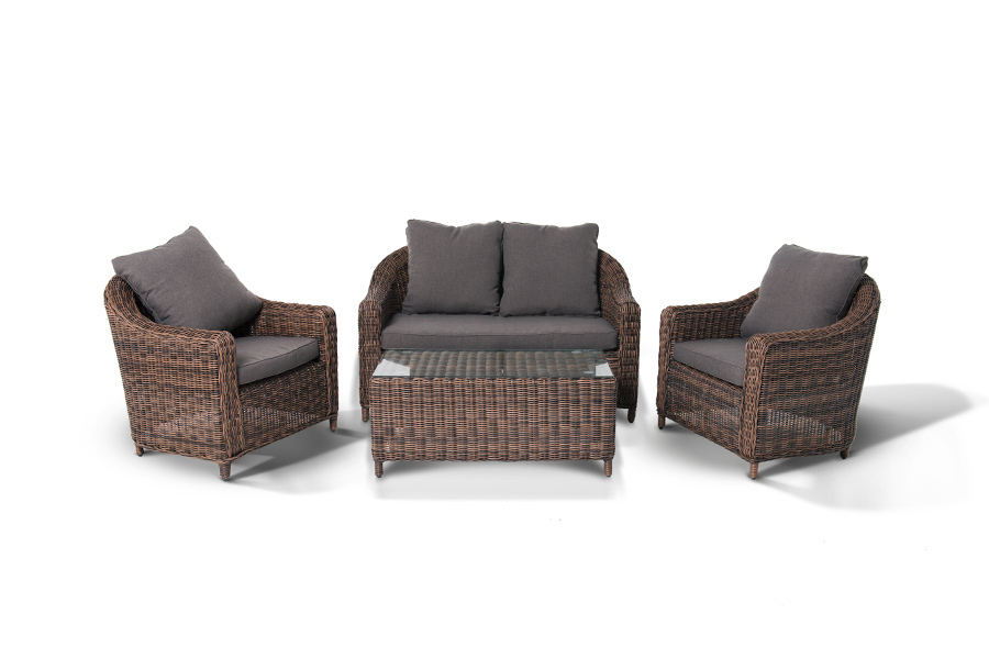 Кон панна, лаунж зона. Лаунж зона из искусственного ротанга: 1 двухместный диван, 2 кресла и журнальный столик со стеклянной столешницей. Алюминиевый каркас, круглый искусственный ротанг, ручное плетение. Диван и кресла оснащены подушками со съемными чехлами. Цвет плетения коричневый Материал каркаса алюминий Материал плетения искусственный ротанг Материал подушки полиэстер 100% плотностью 230гр/м2 с влагоотталкивающей пропиткой Вес(Брутто) 75 Вес 75кг