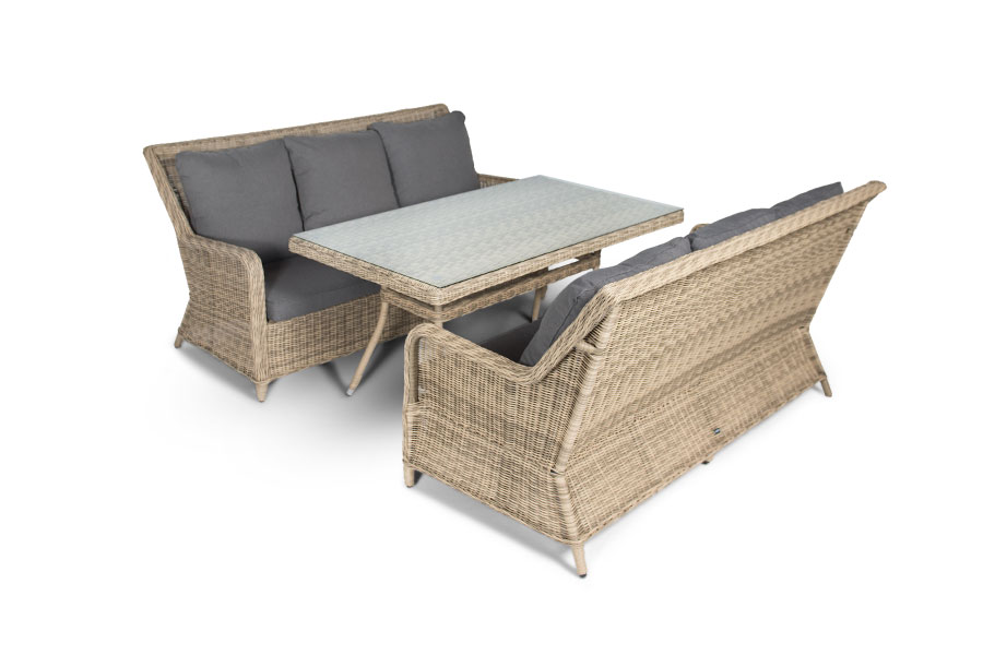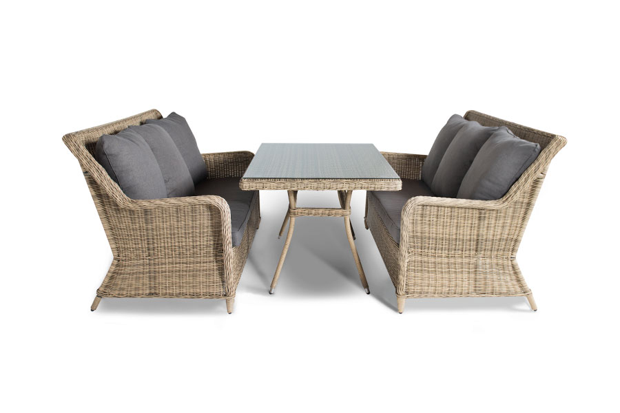 Кортадо, обеденная группа. Обеденная группа Кортадо из искусственного ротанга: 2 трехместных дивана, обеденный стол со стеклянной столешницей. Алюминиевый каркас, искусственный ротанг, круглое плетение,съемные чехлы серого цвета, ручная работа. Материал каркаса Искусственный ротанг, алюминий Материал подушки полиэстер 100% плотностью 230гр/м2 с влагоотталкивающей пропиткой Вес 92кг
