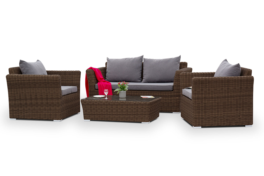 Капучино сингл, лаунж зона, коричневый. Лаунж зона на 4 персоны. 1 двухместный диван, 2 кресла, журнальный столик со стеклянной столешницей толщиной 5 мм. Искусственный ротанг, круглое плетение, алюминиевый каркас. Цвет плетения темно-коричневый Материал каркаса алюминий Материал плетения искусственный ротанг Материал подушки полиэстер 100% плотностью 230гр/м2 с влагоотталкивающей пропиткой Вес(Брутто) 86 Вес 86кг