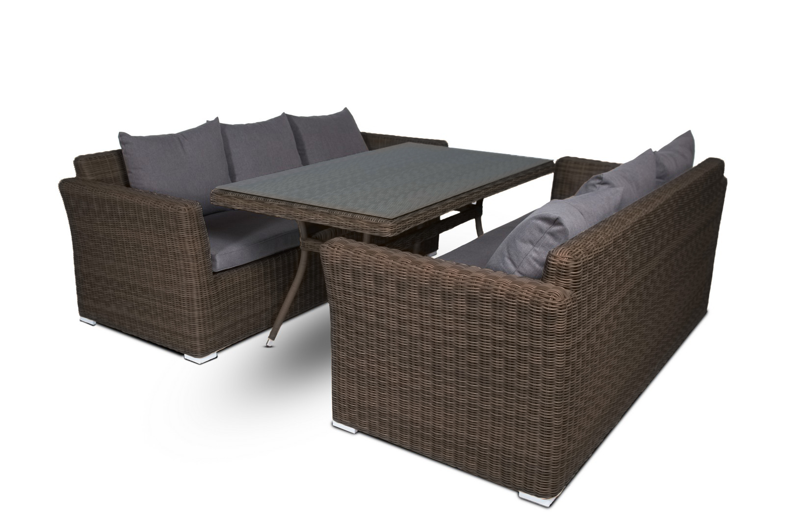 Мокко дабл, обеденная группа, коричневый цвет. Обеденная группа Мокко Дабл из искусственного ротанга: 2 трехместных дивана и обеденный стол со стеклянной столешницей. Алюминиевый каркас, искусственный ротанг, круглое плетение,съемные чехлы серого цвета, ручная работа. Материал каркаса Искусственный ротанг, алюминий Материал подушки полиэстер 100% плотностью 230гр/м2 с влагоотталкивающей пропиткой Вес 111кг