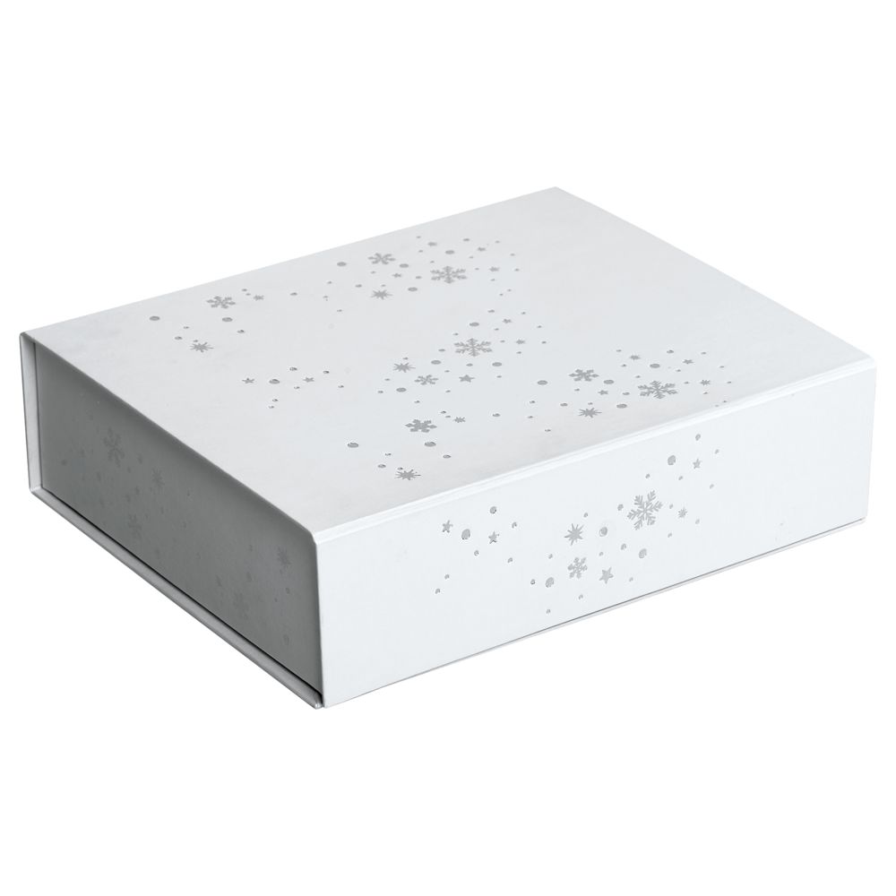Коробка из переплётного картона, кашированного дизайнерской бумагой Majestic Marble White 120 г/м?, с магнитным замочком. Снежинки выполнены методом тиснения серебряной фольгой. Поставляется в собранном виде.