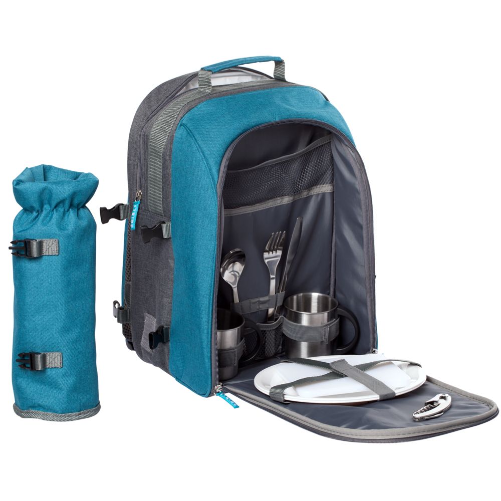 Материал: рюкзак - полиэстер; приборы и кружки - нержавеющая сталь; разделочная доска и тарелки - пластик
