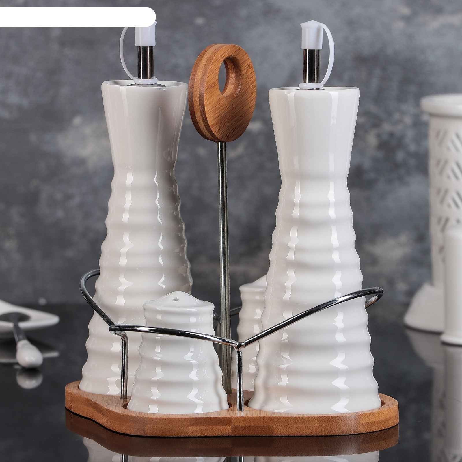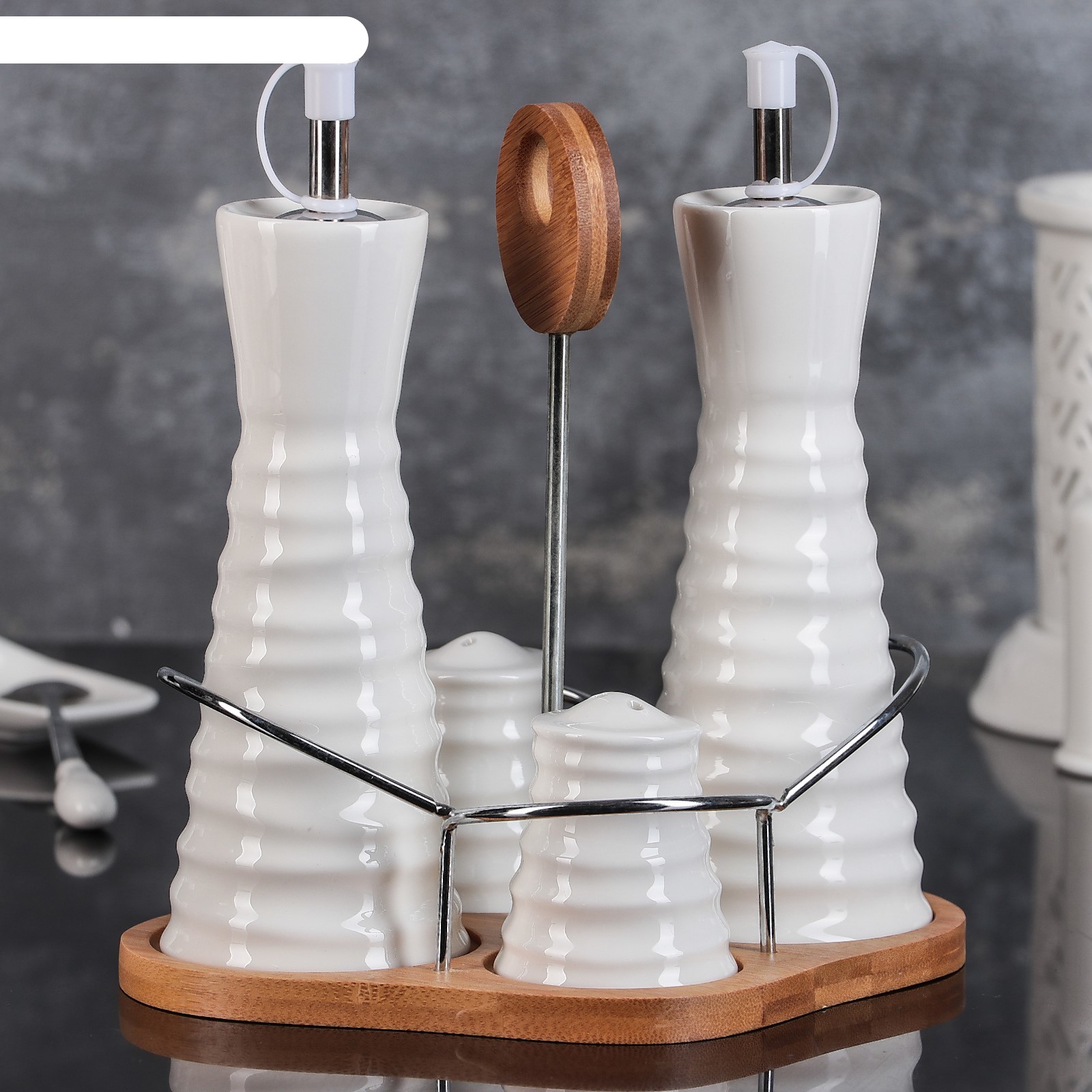 Набор для специй и масел «эстет», 20,5x16x17 см, 4 шт. Размер: 19 см х 17 см х 20 см Вес, гр: 804 Материал: Дерево, керамика, металл, пластик Набор: Да Цвет: Белый Форма: Круглая В наборе, шт.: 4 Объём, мл: 50 Объём, мл: 150 Рисунок: Нет Материал: Керамика Хрупкий груз: Да Склад: КИУ 4  развернуть описание ▼