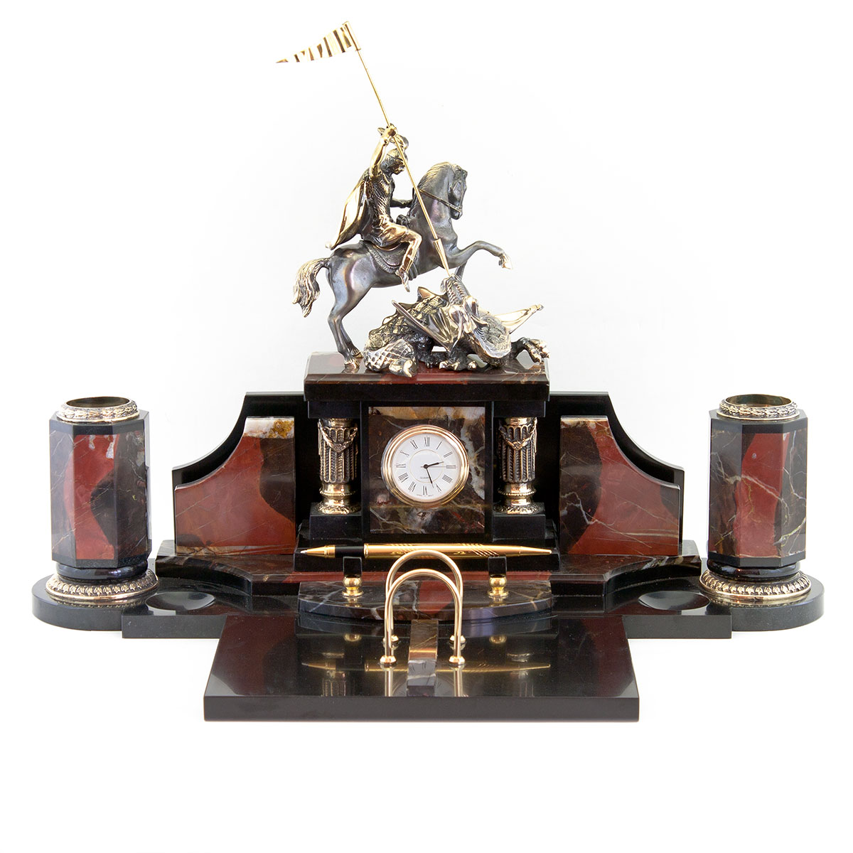 Настольный набор "георгий победоносец" камень яшма. Вес 20000 г Размер часы 53х18х35 см, календарница 24,5х18х2,5 см Материал яшма, долерит, бронза  развернуть описание ▼