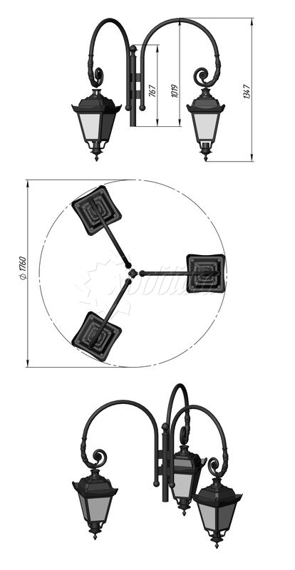 Фонарный столб ретро-3 со светильниками 4,519 м.. Подробные характеристики Материалы: Основание и кронштейн: Чугунное художественное литьё. Покрыты порошковой полимерной краской. Возможность выбора цвета по каталогу RAL. Стандартный цвет (по умолчанию) - черный + бронзовое патинирование. Стойка: Сталь. Покрыта порошковой полимерной краской. Возможность выбора цвета по каталогу. Стандартный цвет (по умолчанию) - черный + бронзовое патинирование. Светильник: Шар 400 мм. Технические характеристики: Источник света: Патрон E-27 под лампу накаливания до 150 Вт, либо энергосберегающую лампу. Возможна комплектация ПРА под Nat70, Nat100, ДРЛ80, ДРЛ125 и источником света. Возможно комплектование светодиодными модулями. Высота: от 4,519 до 6,019 м Вес: от 58 кг Установка производится путем бетонирования стойки (закладного фундамента), либо бетонированием закладной детали с последующим креплением стойки болтовым соединением. Закладной фундамент заказывается отдельно и в цену не входит. О модели Используется для освещения парков, скверов, коттеджных поселков, частных домов, прилегающих территорий зданий. Установка производится путем бетонирования стойки (закладного фундамента), либо бетонированием закладной детали с последующим креплением стойки болтовым соединением.