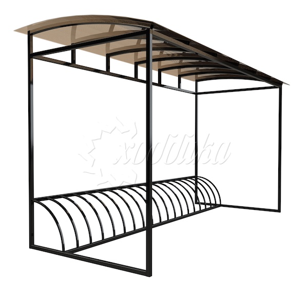 Массовая вело-парковка с количеством мест до 19 штук под навесом, может использоваться в качестве пункта по прокату велосипедов, вело-парковки у торговых или офисных центров и других учреждений. Поставляется в разобранном виде, годится для доставки грузовым транспортом и установке на объекте.