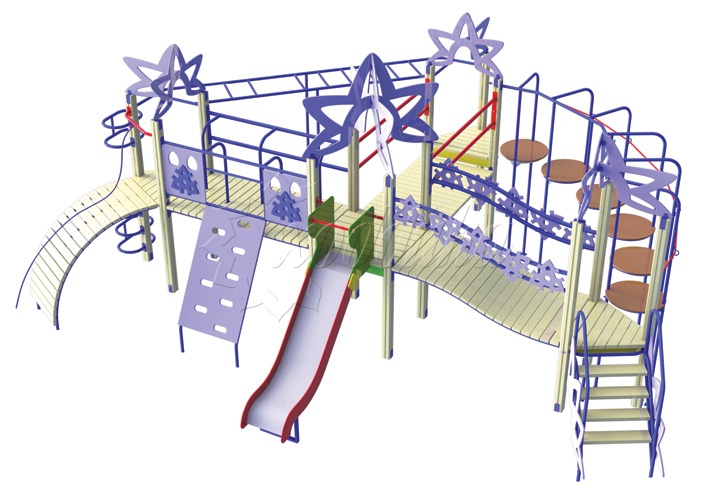 Хбик-02 1. Подробные характеристики Материалы: Деревянные бруски выполнены из сосновой древесины, подвергнуты специальной обработке и сушке до мебельной влажности 7-10%, клееный деревянный брус, влагостойкая фанера, окрашенная двухкомпонентной полиуретановой краской, специально предназначенной для применения на детских площадках, стойкой к сложным погодным условиям, истиранию, устойчивой к воздействию ультрафиолета и влаги. Окрашенный порошковой краской металл. Заглушки пластиковые, разных цветов, на места резьбовых соединений. Сверху на столбы установить пластиковые заглушки синего цвета в форме четырехгранной усеченной пирамиды. Технические характеристики: Ширина: 5603 мм Длина: 7617 мм Высота: 3388 мм О модели Полы выполнены из бруса сечением не менее 40х90 мм. Брус соединен со столбами стягивающим уголком, с внутренней стороны из оцинкованной стали толщиной не менее 2 мм. Каркас горки выполнен из профильной трубы сечением не менее 50х25 мм, утопленный в отфрезерованный паз в борте ската по всей длине. Желоб горки изготовлен из единого листа нержавеющей стали, толщиной не менее 2 мм, приваренным к каркасу горки. Лестницы: ступеньки выполнены из деревянного бруса сечением не менее 50х90 мм. Ступени утоплены в отфрезерованные пазы в перилах лестницы. Перила изготовлены из доски сечением не менее 40х90 мм и фанеры толщиной 14-16 мм. Для бетонирования используются металлические закладные детали из трубы сечением 50х25 мм, закрепленные на перилах и окрашенные порошковой полимерной краской. Конструктивные особенности: установлены четыре башни, расположенные в форме «треугольника». Три башни– трехгранные, одна башня — четырехгранная. Башни соединены: первая (трёхгранная) и четвертая (четырёхгранная), вторая (трёхгранная) и четвертая (четырёхгранная) равновысоким мостом. Каркас моста выполнен из профильной трубы сечением не менее 50х25 мм и крепиться к опорным брусьям башен. Мост обшит брусом, сечением не менее 40х90 мм. Перила моста изготовлены из металлической трубы сечением не менее 42 мм. Третий (трёхгранный) и четвертый (четырёхгранный) соединены разновысоким мостом. Каркас моста выполнен из профильной трубы сечением не менее 50х25 мм и крепится к опорным брусьям башен. Мост обшит брусом, сечением не менее 40х90 мм. Перила моста изготовлены из металлической трубы сечением не менее 42 мм. Первая (трёхгранная) и вторая (трёхгранная) соединены рукоходом из металлической трубы, диаметром не менее 26 мм для ступенек, и 32 мм для бокового основания. Вторая (трёхгранная) и третья (трёхгранная) соединены ступенчатым переходом «Кочки» из металлической трубы, диаметром не менее 26 мм для ступенек, и 32 мм для бокового основания. На ступеньках предусмотрены фанерные накладки из влагостойкой фанеры. На башни первую, вторую, третью и четвертую установлены крыши «Снежинка» из фанерных сегментов (толщиной не менее 15 мм), соединенных металлическими кронштейнами. На первой башне установлено: ступеньки винтообразные (из металлической трубы диаметром не менее 32 мм), мостик с канатом. На третьей башне установлена лестница. На четвертой башне установлено: горка напротив перехода. На равновысоком переходе, соединяющем первую и четвертую башни установлено: шведская стенка из влагостойкой фанеры. Все фанерные элементы имеют скругленные кромки.