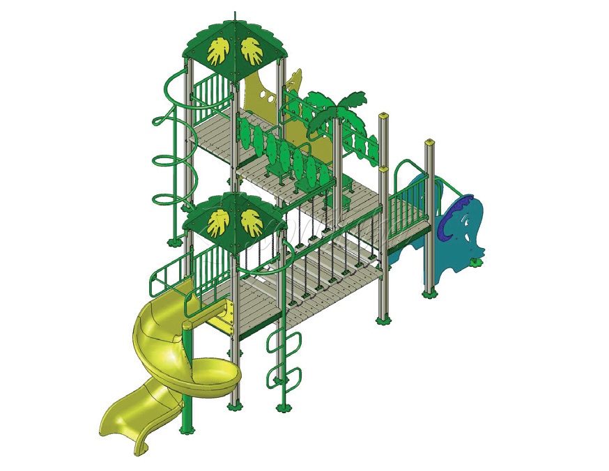 Хбик-03 1. Подробные характеристики Технические характеристики: Ширина: 5090 мм Длина: 6790 мм Высота: 3251 мм О модели Игровой комплекс предназначен для установки на территориях школьных и дошкольных учреждений, а также в парках, во дворах многоквартирных домов или в частном секторе. Габаритные размеры (ДхШхВ) 6790х5090х3270 мм. Игровая зона - 9790х8090 мм. Наибольшая высота от уровня земли до отметки площадок - 1500 мм. Высота спуска горки (от стартовой площадки до земли) — 1500 мм. Применяемые материалы: трехслойный радиально распиленный сосновый клееный брус (покрыт краской, устойчивой к климатическим изменениям), влагостойкая фанера, металлические элементы в порошковой покраске; соединения и верх стоек закрыты пластиковыми заглушками; нержавеющая сталь для скатов горок, спиральная пластиковая горка-скат. Игровой комплекс на стойках из клееного бруса, верхняя часть стоек закрыта пластиковой заглушкой. Полы площадок и переходов выполнены из древесины. Крыши площадок двускатные, из влагостойкой фанеры. Материал скатов горок – стеклопластик. Ограждения лестниц и экраны площадок снабжены защитными накладками из влагостойкой фанеры. Цветовая гамма комплекса – «синий, красный, желтый». Комплекс оборудован следующими элементами: игровой комплекс состоит из 3 соединенных башен: первая башня оборудована фанерной крышей с декоративными изображениями листьев, лестницей с перилами и защитными экранами в виде слоненка. Первая и вторая башни соединены между собой деревянным прямым мостиком с подвесными качающимися брусками, перилами и страховочным мостиком. Вторая башня оборудована открытой пластиковой винтообразной горкой Н=2 м, соединительный мостик горки с площадкой оборудован ограничительными бортиками, выполненными из металлических поручней, окрашенных порошковой краской, и полом, выполненным из влагостойкой ламинированной фанеры с нескользящим покрытием. Стартовая площадка горки закрыта с двух боков металлическими экранами и оборудована металлическим защитным поручнем-ограничителем. Так же, башня оборудована шестом-зигзагом и декоративными фанерными элементами на внутренней стойке в виде пальмы. Первая и третья башни соединены мостиком с лабиринтом в виде металлических поручней, расставленных в шахматном порядке. Третья башня оборудована лестницей с перилами и защитным фанерным экраном в виде жирафа и шестом-спиралью. Функциональный состав комплекса: Три площадки, две крыши, пластиковая винтовая горка, две лестницы, шест-спираль, шест-зигзаг, лабиринт, подвесной мостик, декоративные фигуры животных и пальм. Игровой комплекс соответствует ГОСТ Р 52168-2003, ГОСТ Р 52169-2003, ГОСТ Р 52301-2004, имеет паспорт на изделие.