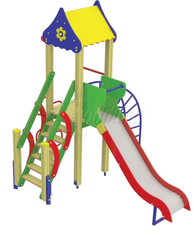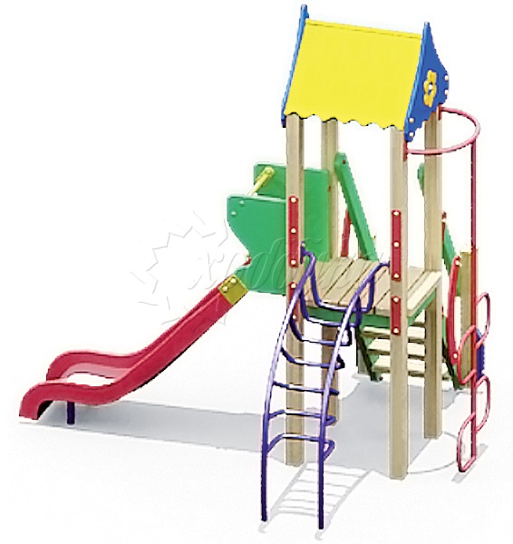 Хбик-05 1. Подробные характеристики Материалы: Трехслойный радиально распиленный сосновый клееный брус 100х100 (покрыт краской, устойчивой к климатическим изменениям), влагостойкая фанера, металлические элементы в порошковой покраске, соединения и верх стоек закрыты пластиковыми заглушками, нержавеющая сталь для скатов горок, металлический лаз, металлическая змейка. Игровой комплекс на стойках из клееного бруса, верхняя часть стоек закрыта пластиковой заглушкой. Полы площадок и переходов выполнены из древесины. Крыши площадок двускатные, из влагостойкой фанеры. Материал скатов горок – нержавеющая сталь. Ограждения лестниц и экраны площадок снабжены защитными металлическими ограждениями. Цветовая гамма комплекса – «синий, красный, желтый, зеленый». Технические характеристики: Ширина: 2667 мм Длина: 3032 мм Высота: 3080 мм