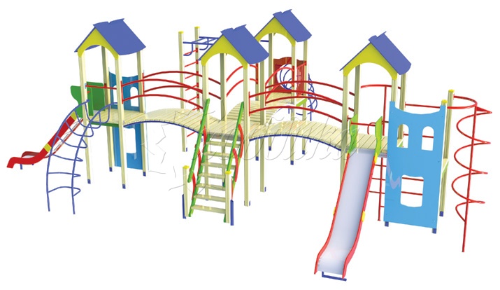Декоративные фанерные элементы: водостойкая фанера толщиной 15 мм. (± 2мм). Столбы выполнены из клееного бруса, сечением не менее 100х100 мм и имеющие скругленный профиль с канавкой посередине. Снизу столбы оканчиваются металлическими оцинкованными подпятниками, которые бетонируются в землю. Полы выполнены из бруса сечением не менее 40х90 мм. Брус соединен со столбами стягивающим уголком с внутренней стороны из оцинкованной стали толщиной не менее 2 мм. Каркас горки выполнен из профильной трубы сечением не менее 50х25 мм, утопленный в отфрезерованный паз в борте ската по всей длине. Желоб горки изготовлен из единого листа нержавеющей стали, толщиной не менее 2 мм, приваренный к каркасу горки. Лестницы ступеньки выполнены из деревянного бруса сечением не менее 50х90 мм. Ступени утоплены в отфрезерованные пазы в перилах лестницы. Перила изготовлены из доски сечением не менее 40х90 мм и фанеры толщиной 14-16 мм. Для бетонирования используются металлические закладные детали из трубы сечением 50х25 мм, закрепленные на перилах и окрашенные порошковой полимерной краской. Конструктивные особенности. Установить три четырехгранные башни. Башни соединены: первую (четырёхгранную) и вторую (четырёхгранную) равновысоким дугообразным мостом. Каркас моста выполнен из профильной трубы сечением не менее 50х25 мм и крепится к опорным брусьям башен. Мост обшит брусом сечением не менее 40х90 мм. Перила моста изготовлены из металлической трубы сечением не менее 42 мм. На четырёхгранные башни установлены крыши из четырех фанерных сегментов (толщиной не менее 15 мм), соединенные металлическими кронштейнами. На первой башне установлено: лаз кольцеобразный (из металлической трубы диаметром не менее 32 мм), горка, напротив перехода, мостик с канатом. На второй башне установлено: лестница, спираль металлическая. Башни соединены: первая (четырёхгранная) и третья (четырёхгранная) деревянным прямым мостиком с подвесными качающимися брусками, перилами и страховочным мостиком. На третьей башне установлен шест-зигзаг, лаз из бруса сечением не менее 40х90 мм с полипропиленовым канатом. Все фанерные элементы имеют скругленные кромки.