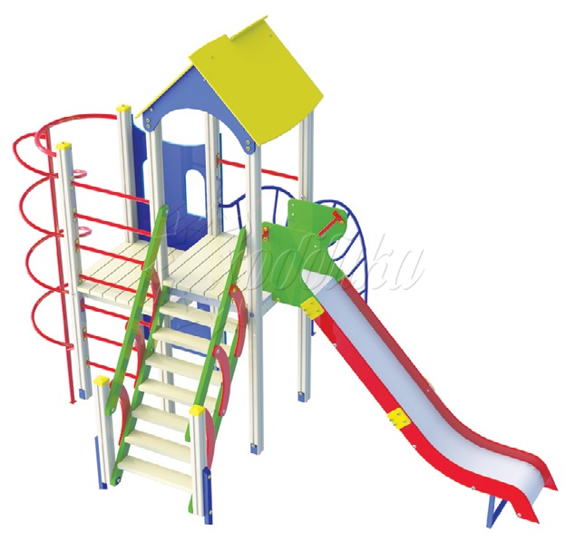 Хбик-07 1. Подробные характеристики Материалы: Деревянные бруски выполнены из сосновой древесины, подвергнуты специальной обработке и сушке до мебельной влажности 7-10%, клееный деревянный брус, влагостойкая фанера, окрашенная двухкомпонентной полиуретановой краской, специально предназначенной для применения на детских площадках, стойкой к сложным погодным условиям, истиранию, устойчивой к воздействию ультрафиолета и влаги. Окрашенный порошковой краской металл. Заглушки пластиковые, разных цветов, на места резьбовых соединений. Сверху на столбы установить пластиковые заглушки синего цвета в форме четырехгранной усеченной пирамиды. Технические характеристики: Ширина: 3878 мм Длина: 5190 мм Высота: 3620 мм О модели Полы выполнены из бруса сечением не менее 40х90 мм. Брус соединен со столбами стягивающим уголком с внутренней стороны из оцинкованной стали толщиной не менее 2 мм. Каркас горки должен быть выполнен из профильной трубы сечением не менее 50х25 мм, утопленный в отфрезерованный паз в борте ската по всей длине. Желоб горки изготовлен из единого листа нержавеющей стали, толщиной не менее 2 мм, приваренный к каркасу горки. Лестница: ступеньки выполнены из деревянного бруса сечением не менее 50х90 мм. Ступени утоплены в отфрезерованные пазы в перилах лестницы. Перила изготовлены из доски сечением не менее 40х90 мм и фанеры толщиной 14-16 мм. Для бетонирования используются металлические закладные детали из трубы сечением 50х25 мм, закрепленные на перилах и окрашенные порошковой полимерной краской. Все фанерные элементы имеют скругленные кромки.