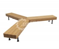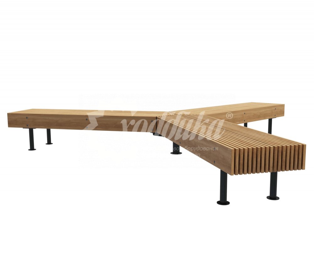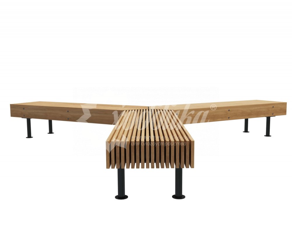 Скамейка «линия трехлучевая». Подробные характеристики Скамейка поставляется в разобранном виде! Внимание! Остерегайтесь подделок! Материалы: Опоры: Сталь. Покрыты порошковой полимерной краской. Возможность выбора цвета по каталогу RAL. Стандартный цвет (по умолчанию) - черный. Сиденье и спинка: Брус из хвойных пород древесины - ангарская сосна (варианты исполнения: лиственница, композитные материалы, термодерево). Огнебиозащитные пропитки + тонировочный состав с антисептиком + два слоя яхтного лака с промежуточным шлифованием. Возможность выбора цвета из палитры. Фурнитура: Оцинкованная. Стандартный цвет (по умолчанию) - серебристый. Возможность использования потайной/скрытой фурнитуры. Технические характеристики: Длина: 2700 мм Длина луча: от 1500 мм Ширина: 3140 мм Высота: 440 мм Ширина сиденья: 530 мм Высота сиденья: 440 мм Вес: от 76 кг О модели Массивное основание состоит из деревянных панелей, надежно стянутых шестью винтами из стали. Основной блок расположен на визуально тонких стальных опорах, создавая при этом ощущение парения в воздухе. Скамья состоит из модулей, позволяющих создать различные линейные или замкнутые комбинации. Деревянные панели в виде «сэндвича» крепятся с помощью винтов к стальному основанию. Варианты цвета на выбор: , махагон, палисандр, тик,