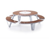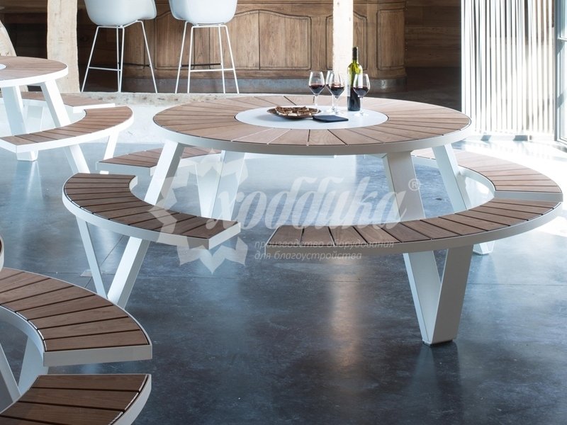 Столешница, сиденье и спинка: Брус из хвойных пород древесины - ангарская сосна (варианты исполнения: лиственница, композитные материалы). Огнебиозащитные пропитки + тонировочный состав с антисептиком + два слоя яхтного лака с промежуточным шлифованием. Возможность выбора цвета из палитры.