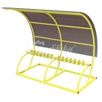 Парковка для самокатов с навесом «лютик». Подробные характеристики Материалы: Парковка: Сталь. Покрыта порошковой полимерной краской. Возможность выбора цвета по каталогу RAL. Технические характеристики: Кол-во мест: 14 Длина: 1760 мм Ширина: 920 мм Высота: 1620 мм Разделители мест имеют отверстия для фиксации самокатов с помощью цепей и шнуров с замком. Монтаж - анкерными болтами на ровную бетонную поверхность.