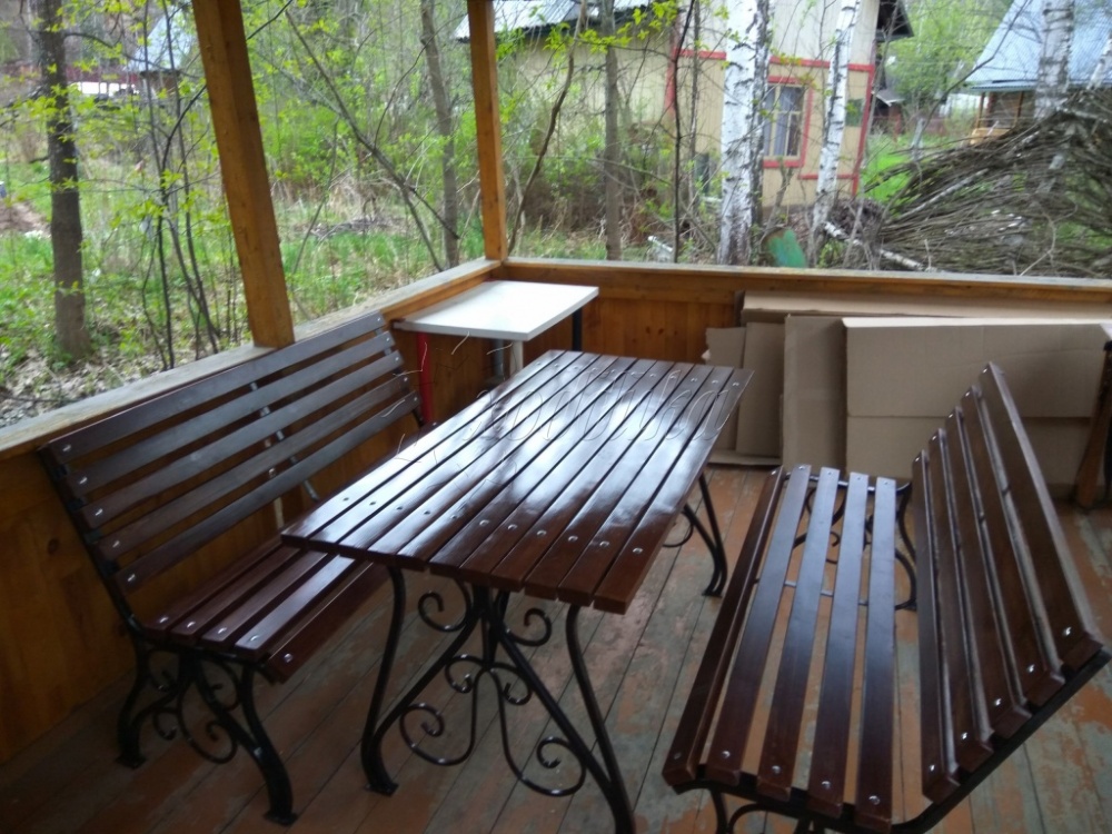 Столешница, сиденье и спинка: Брус из хвойных пород древесины - сосна/ель (варианты исполнения: лиственница, композитные материалы) различного сечения. Огнебиозащитные пропитки + тонировочный состав с антисептиком + два слоя яхтного лака с промежуточным шлифованием. Возможность выбора цвета из палитры.