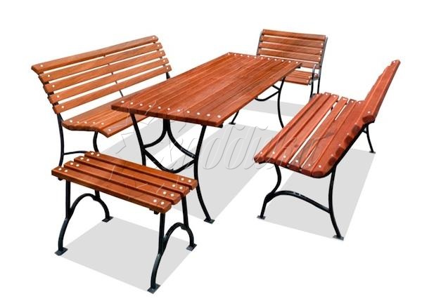 Столешница, сиденье и спинка: Брус из хвойных пород древесины - сосна/ель (варианты исполнения: лиственница, композитные материалы) различного сечения. Огнебиозащитные пропитки + тонировочный состав с антисептиком + два слоя яхтного лака с промежуточным шлифованием. Возможность выбора цвета из палитры.