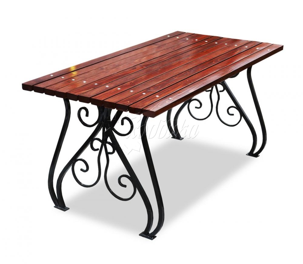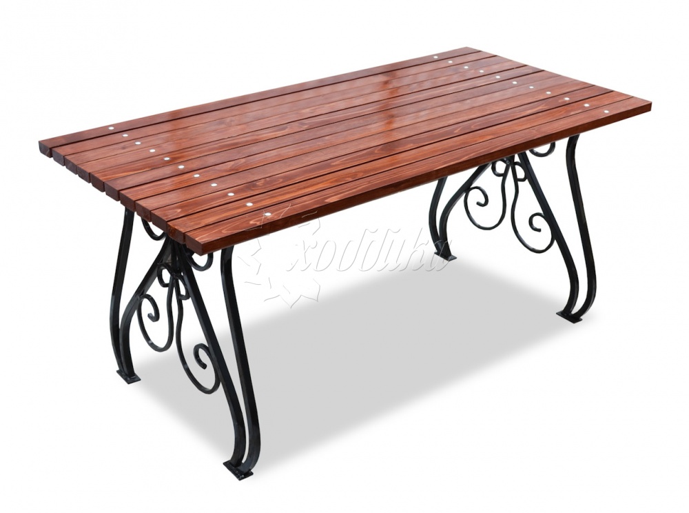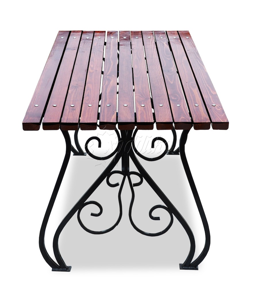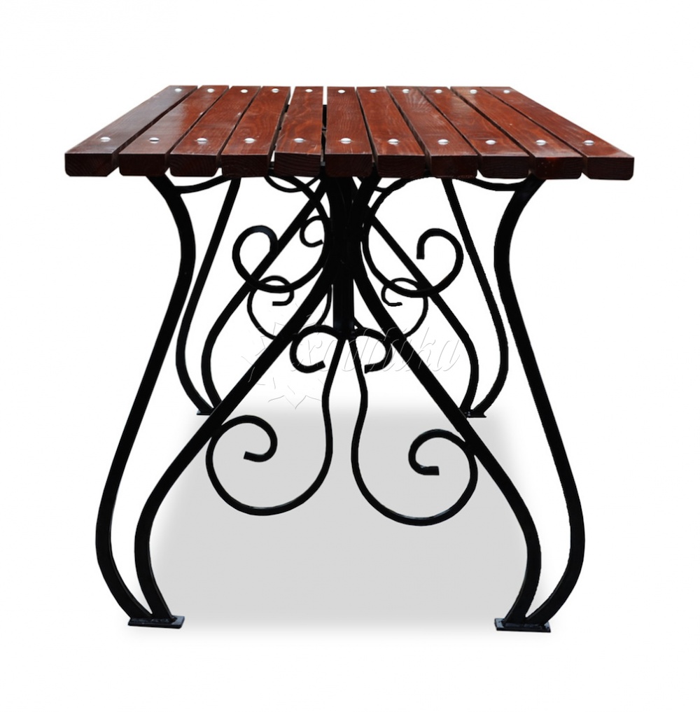 Стол кованый «вена» 1,5 м. Подробные характеристики Стол имеет дополнительную защиту от раскачивания. Материалы: Опоры: Cталь. Покрыты порошковой полимерной краской. Возможность выбора цвета по каталогу RAL. Стандартный цвет (по умолчанию) - черный. Столешница: Брус из хвойных пород древесины - сосна/ель (варианты исполнения: лиственница, композитные материалы) различного сечения. Огнебиозащитные пропитки + тонировочный состав с антисептиком + два слоя яхтного лака с промежуточным шлифованием. Возможность выбора цвета из палитры. Фурнитура: Оцинкованная. Возможность выбора цвета фурнитуры по каталогу RAL. Стандартный цвет (по умолчанию) - серебристый. Возможность использования потайной/скрытой фурнитуры. Технические характеристики: Высота: 760 мм Ширина: 700 мм Длина: 1200 - 3000 мм Ширина столешницы: 700 мм Длина столешницы: 1200 - 3000 мм Вес версии 1.2 м: 28,6 кг Вес версии 1.5 м: 31,2 кг Вес версии 1.8 м: 33,8 кг Вес версии 2.0 м (2 опоры): 35,6 кг Вес версии 2.5 м (3 опоры): 45,3 кг Вес версии 3.0 м (3 опоры): 49,9 кг О модели Стол для сада «Вена» порадует вас декоративными коваными элементами опор. Этот стол не займёт много места на вашей даче, однако он вместительный, лёгкий и прочный. Закажите к нему стальные скамейки - сделайте свой отдых более душевным и приятным. Варианты цвета на выбор: , палисандр, махагон, тик,