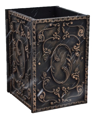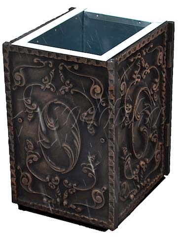 Урна чугунная квадратная «ампир» объём: ? литров. Подробные характеристики Материалы: Боковины: Чугунное художественное литьё. Покрыты порошковой полимерной краской. Возможность выбора цвета по каталогу RAL. Стандартный цвет (по умолчанию) - черный + бронзовое патинирование. Ёмкость для мусора: Оцинкованное съёмное ведро. Технические характеристики: Объем: от 30 л Высота: 540 мм Ширина: 340 мм Глубина: 390 мм Вес: от 74 кг О модели Массивная, парковая урна, оборудованная съемным ведром. Размеры и вес урны обеспечивают ее сохранность. Данная модель популярна при обустройстве больших классических парков в сочетании со скамейками на чугунном основании.