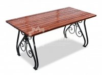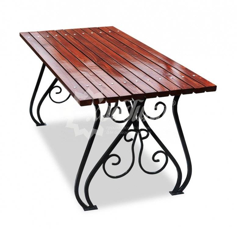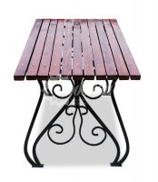 Стол кованый «вена». Подробные характеристики Стол имеет дополнительную защиту от раскачивания. Материалы: Опоры: Cталь. Покрыты порошковой полимерной краской. Возможность выбора цвета по каталогу RAL. Стандартный цвет (по умолчанию) - черный. Столешница: Брус из хвойных пород древесины - сосна/ель (варианты исполнения: лиственница, композитные материалы) различного сечения. Огнебиозащитные пропитки + тонировочный состав с антисептиком + два слоя яхтного лака с промежуточным шлифованием. Возможность выбора цвета из палитры. Фурнитура: Оцинкованная. Возможность выбора цвета фурнитуры по каталогу RAL. Стандартный цвет (по умолчанию) - серебристый. Возможность использования потайной/скрытой фурнитуры. Технические характеристики: Высота: 760 мм Ширина: 700 мм Длина: 1200 - 3000 мм Ширина столешницы: 700 мм Длина столешницы: 1200 - 3000 мм Вес версии 1. 2 м: 28,6 кг Вес версии 1. 5 м: 31,2 кг Вес версии 1. 8 м: 33,8 кг Вес версии 2. 0 м (2 опоры): 35,6 кг Вес версии 2. 5 м (3 опоры): 45,3 кг Вес версии 3. 0 м (3 опоры): 49,9 кг О модели Стол для сада «Вена» порадует вас декоративными коваными элементами опор. Этот стол не займёт много места на вашей даче, однако он вместительный, лёгкий и прочный. Закажите к нему стальные скамейки - сделайте свой отдых более душевным и приятным. Варианты цвета на выбор: , палисандр, махагон, тик,